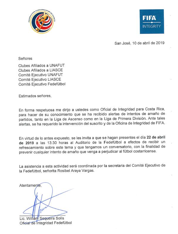 "En forma respetuosa me dirijo a ustedes como Oficial de Integridad para Costa Rica, para hacer de su conocimiento que se ha recibido alertas de intentos de amaño de partidos, tanto en la Liga de Ascenso como en la Liga de Primera División. Ante tales alertas, se ha requerido la intervención del suscrito y de la Oficina de Integridad de FIFA", se lee en el documento.