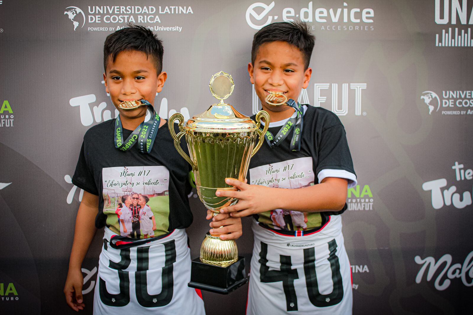 Los gemelos Juan Pablo y José Pablo Serrano Gómez, de once años, fueron los encargados de levantar el trofeo de campeones de la categoría U-11, una vez que Liga Deportiva Alajuelense le ganó esa final al Club Sport Herediano, en los torneos de liga menor.