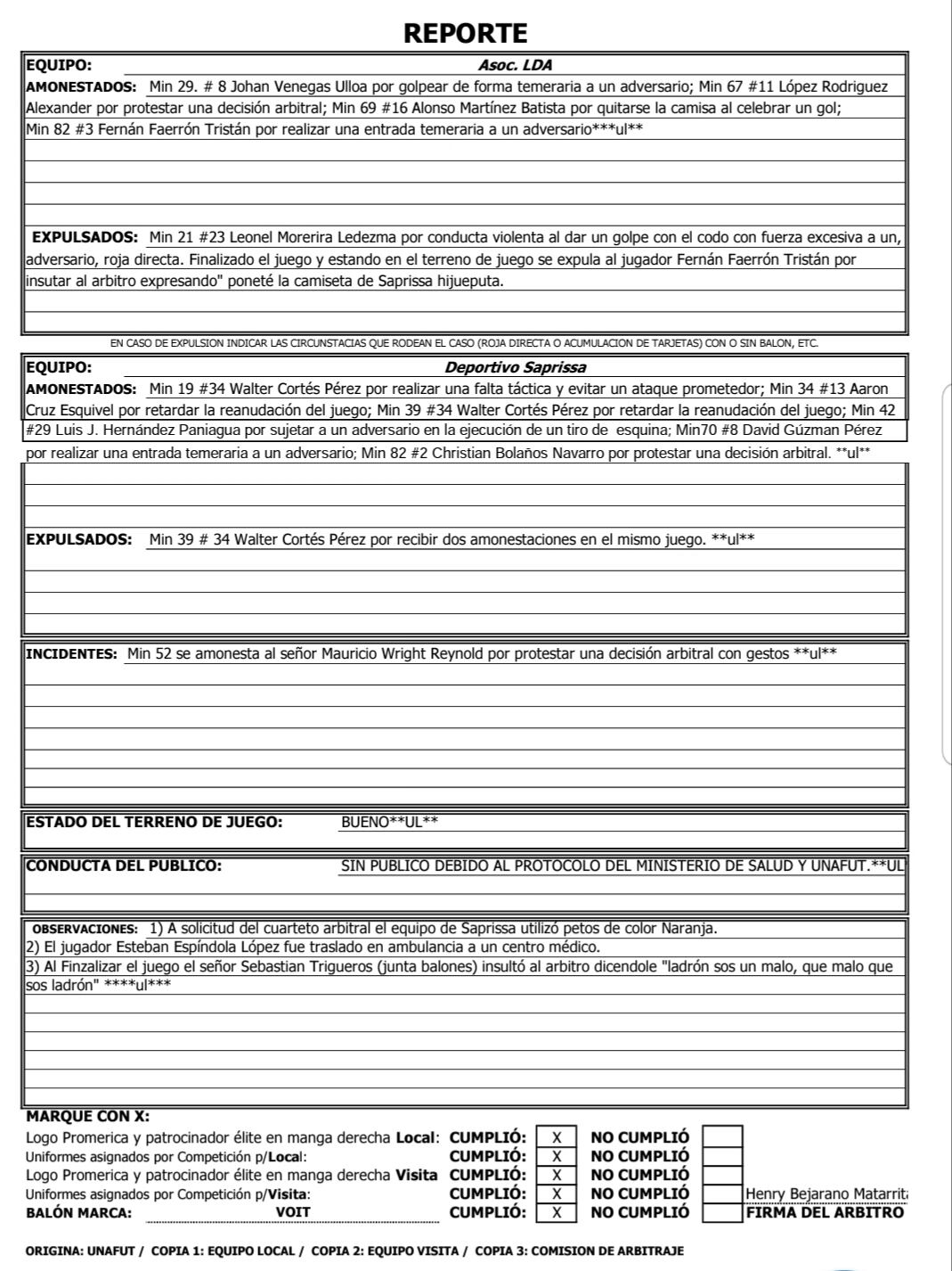 Bejarano explicó así las amonestaciones a integrantes de Alajuelense: “Minuto 29, Johan Venegas Ulloa por golpear de forma temeraria a un adversario. Minuto 67, López Rodríguez Alexánder por protestar una decisión arbitral. Minuto 69, Alonso Martínez Batista por quitarse la camisa al celebrar un gol. Minuto 82, Fernán Faerron por realizar una entrada temeraria a un adversario”.