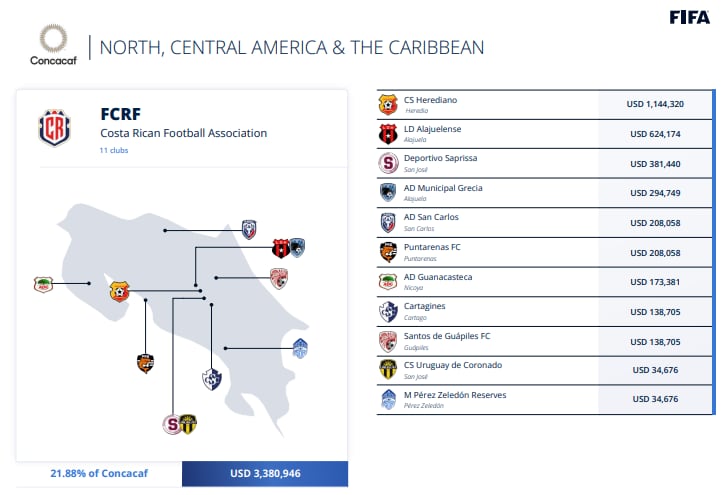 En el caso de Costa Rica, se repartieron en total $3,3 millones. Este dinero se distribuyó entre 11 clubes, 10 de Primera División y uno de la Liga de Ascenso. La liga tica fue la tercera en el área que más recibió, por detrás de la de Estados Unidos y la mexicana.