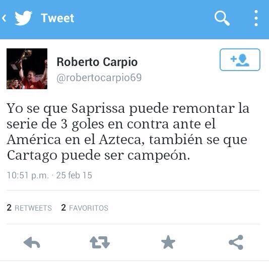 Carpio utilizó la plataforma de Twitter para hacer sátira sobre que los morados podrían remontar el 0-3 en el Estadio Azteca y Cartaginés fuera campeón nacional: "Yo se que Saprissa puede remontar la serie de 3 goles en contra ante el América en el Azteca, también se que Cartago puede ser campeón", escribió.