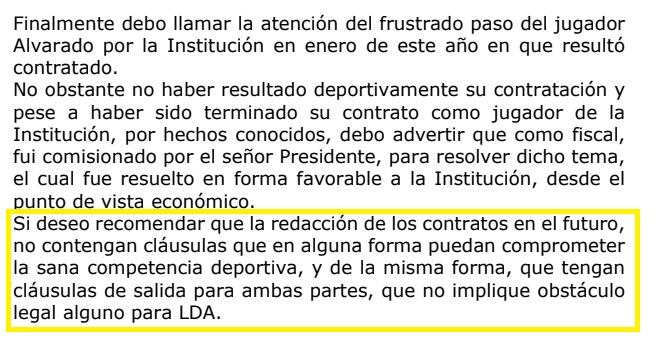 “Debo llamar la atención del frustrado paso del jugador Alvarado por la institución en enero de este año en que resultó contratado. No obstante no haber resultado deportivamente su contratación y pese a haber sido terminado su contrato como jugador de la institución, por hechos conocidos, debo advertir que como fiscal, fui comisionado por el señor Presidente, para resolver dicho tema, el cual fue resuelto en forma favorable a la Institución, desde el punto de vista económico", añade.