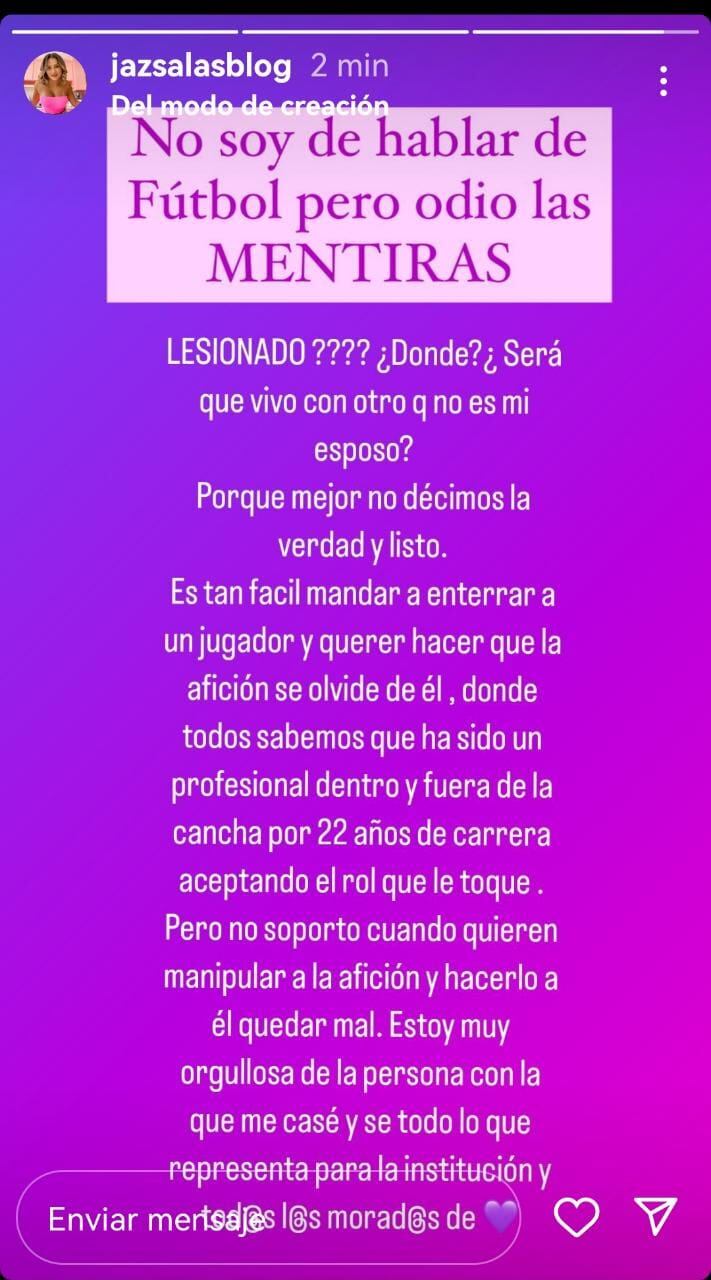 “No soy de hablar de fútbol pero odio las mentiras. ¿Lesionado?, ¿Dónde?, ¿Será que vivo con otro que no es mi esposo?”Porque mejor no decimos la verdad y listo. Es tan fácil mandar a enterrar a un jugador y querer hacer que la afición se olvide de él, donde todos sabemos que ha sido un profesional dentro y fuera de la cancha por 22 años de carrera aceptando el rol que le toque”, escribió Salas.
