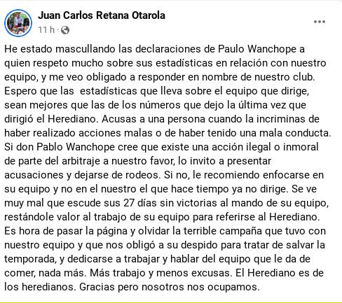 En el club florense no se habían pronunciado al respecto, hasta que Retana escribió que ha estado mascullando las declaraciones de Paulo Wanchope, a quien respeta, sobre sus estadísticas en relación con su equipo, y se vio obligado a responder en nombre de Herediano.