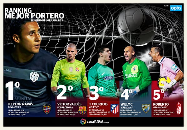 El sitio oficial de la Liga BBVA destacó que el guardavallas del Levante acumula un 77,7% de acierto en sus paradas, y es el que más intervenciones ha realizado con 129. A Navas le han anotado en 37 oportunidades.