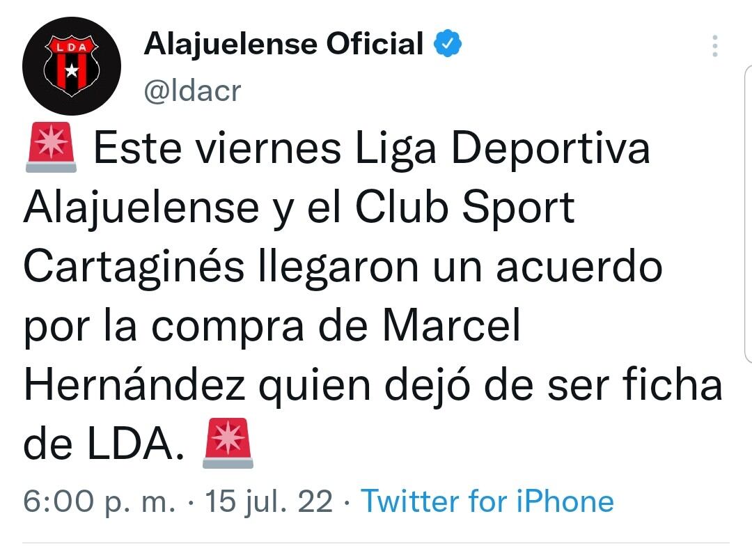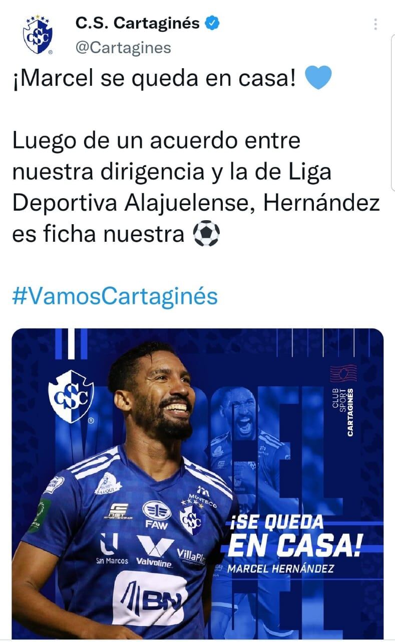 “No, no. Fue un tema que manejamos entre dirigencias, Marcel sigue siendo jugador de Liga Deportiva Alajuelense hasta el 31 de diciembre del 2022, así como lo dice el contrato y esto no ha cambiado desde que Marcel llegó a Cartaginés en enero”, respondió.