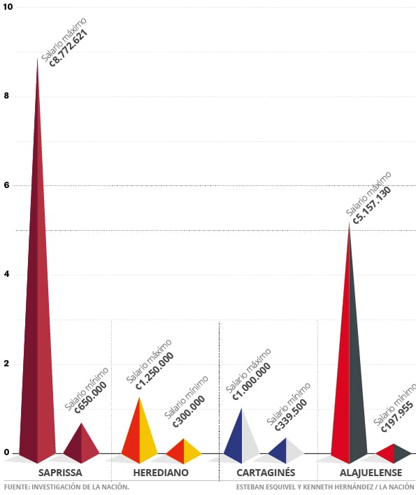 ¢7,5 millones es la brecha entre el futbolista mejor pagado de Saprissa con respecto al del Herediano, mientras que Cartaginés reportó ¢1.000.000 de sueldo máximo, cinco veces menos que el jugador más caro de Liga Deportiva Alajuelense.