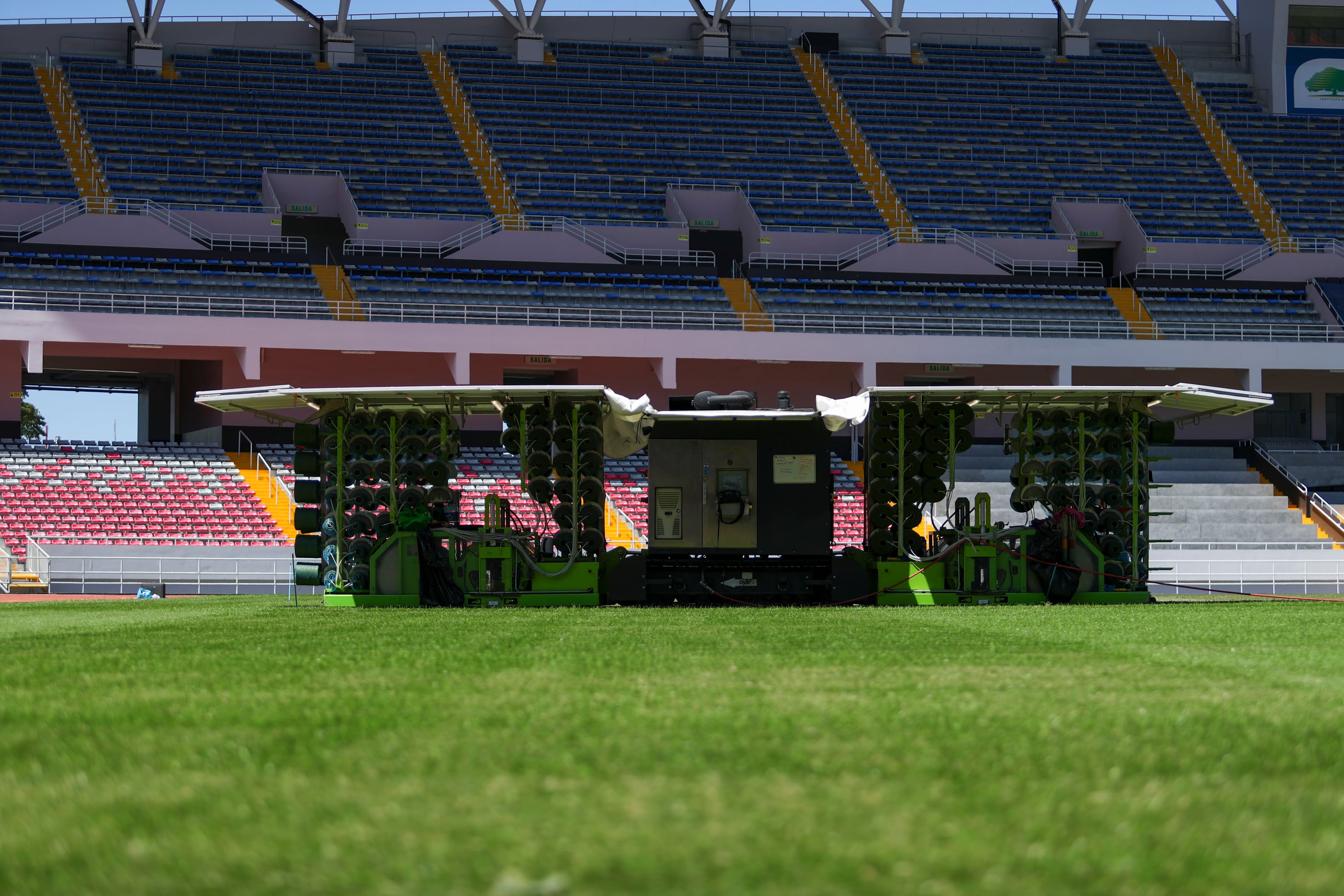 Esta enorme máquina de coser zacate sintético, cuya casa matriz está en Inglaterra, actualmente se encuentra en el Estadio Nacional, precisamente cosiendo la nueva gramilla de la Joya de La Sabana.