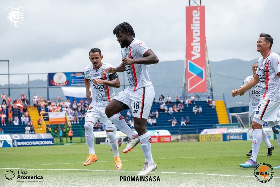 El primer gol de Puntarenas llegó desde un saque de banda. Jemarck Hernández tomó el balón y con fuerza brutal lo colocó en los linderos del área pequeña, donde Anthony Hernández lo peleó y custodió mientras rebotaba, hasta que Jurguens Montenegro logró rematar, lo estrelló en el horizontal y el rebote lo ganó Yoserth Hernández, que de cabeza lo envió a la guarida de Kevin Briceño.
