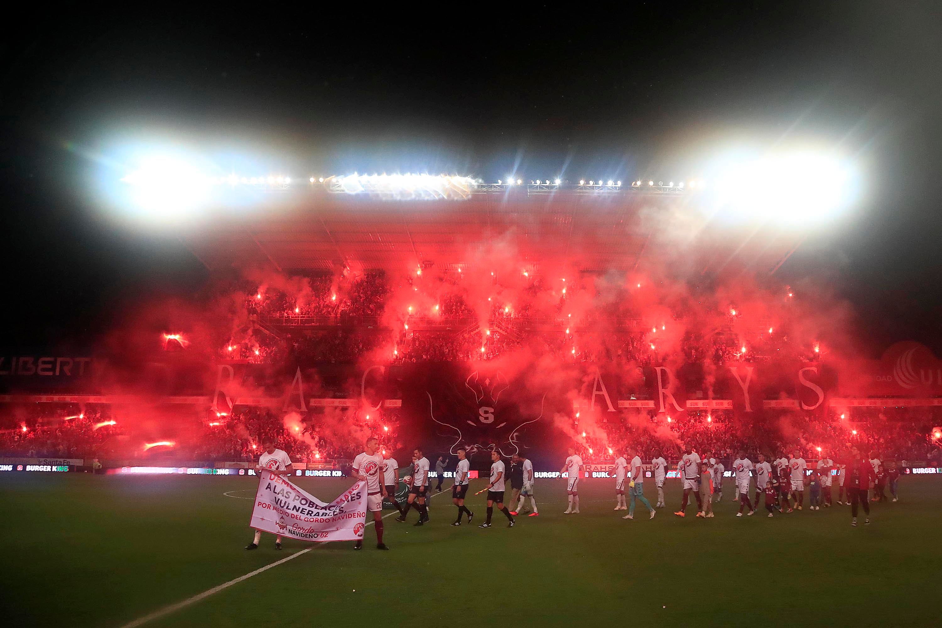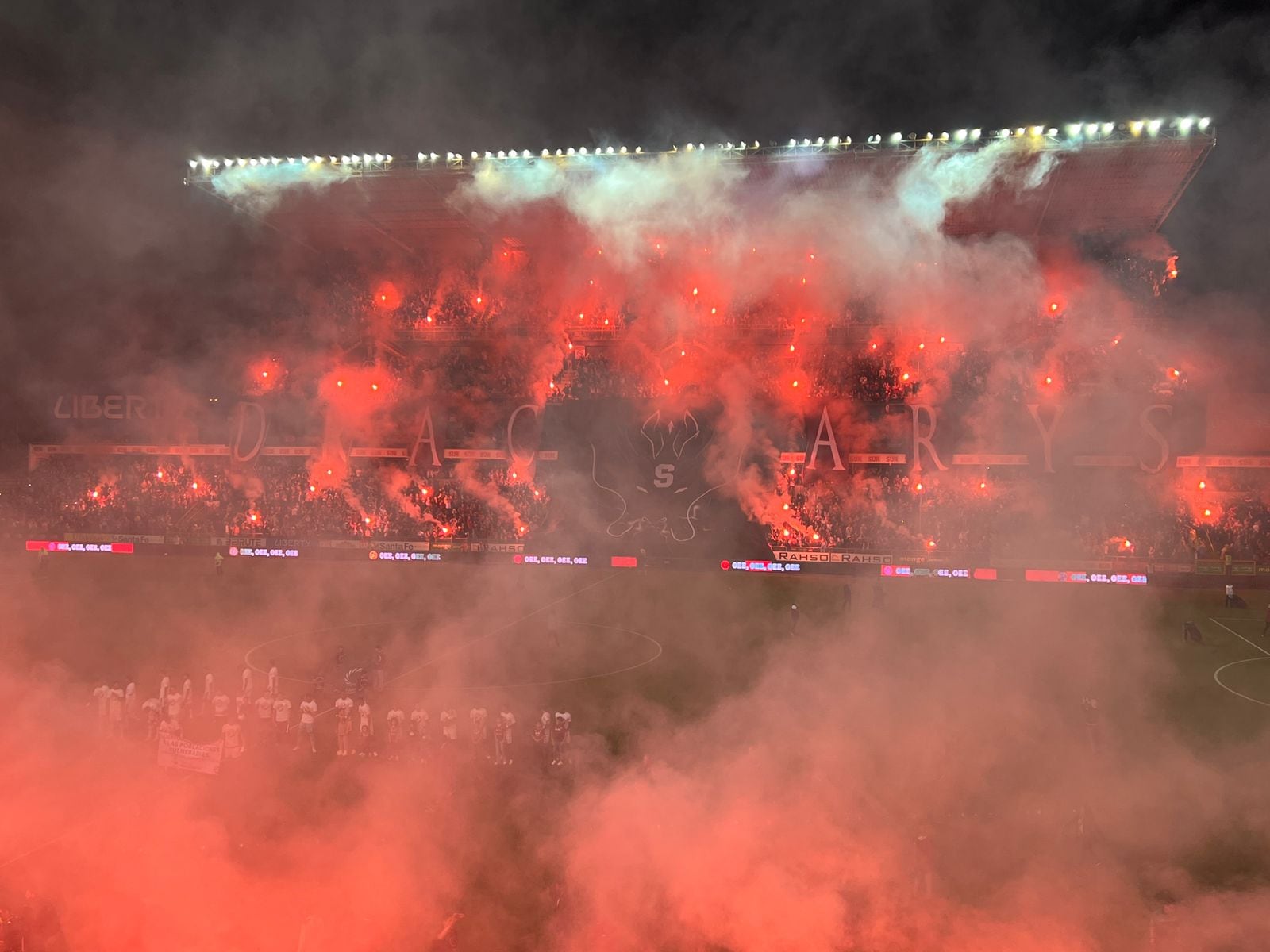 Las graderías moradas se tiñeron de rojo gracias a las bengalas que se posicionaron en diferentes partes; por otra parte mantas fueron extendidas con dragones; además de una camisa gigante de la S.