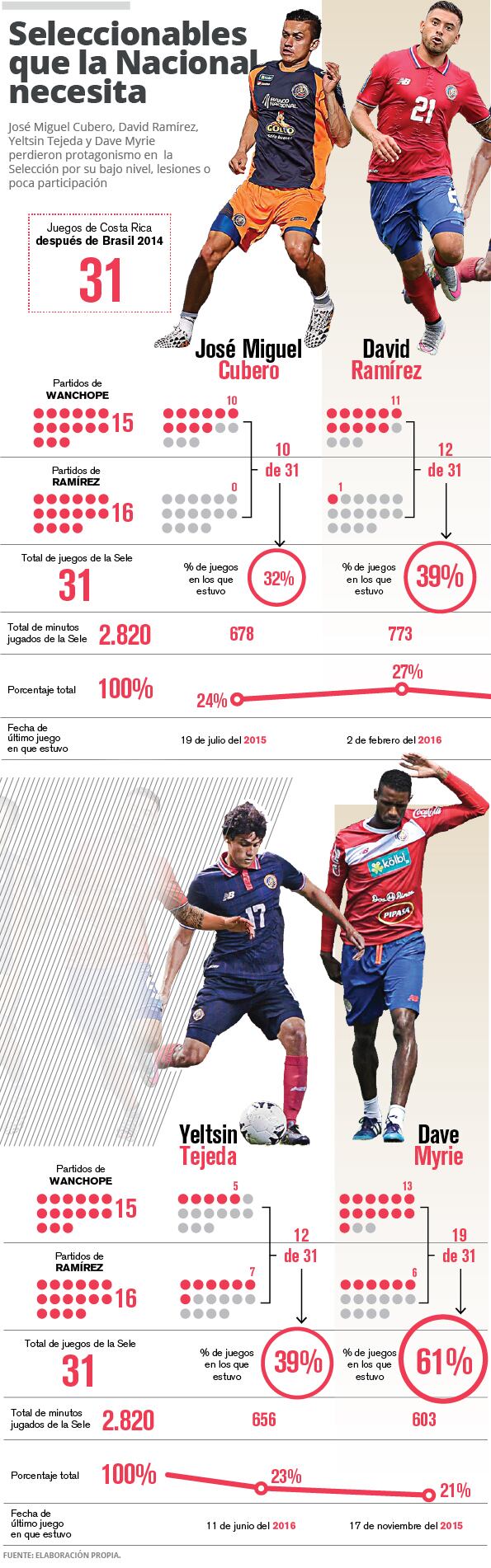 Yeltsin Tejeda, José Miguel Cubero, David Ramírez y el mismo Dave Myrie fueron caras habituales en la Tricolor , unos antes y durante el Mundial de Brasil 2014, y otros después de esta justa. Sin embargo, bajones en sus niveles, tiempos prolongados sin ver acción o lesiones los excluyeron poco a poco de las listas de Óscar Ramírez.