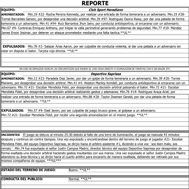 “Una vez expulsado y encontrándose dentro del terreno de juego, el jugador #21, Escobar Mendieta Fidel, del equipo Deportivo Saprissa, se dirigió hacia el árbitro asistente número 1, diciendo a viva voz: sos bien malo, sos remalo”, se lee en el informe.