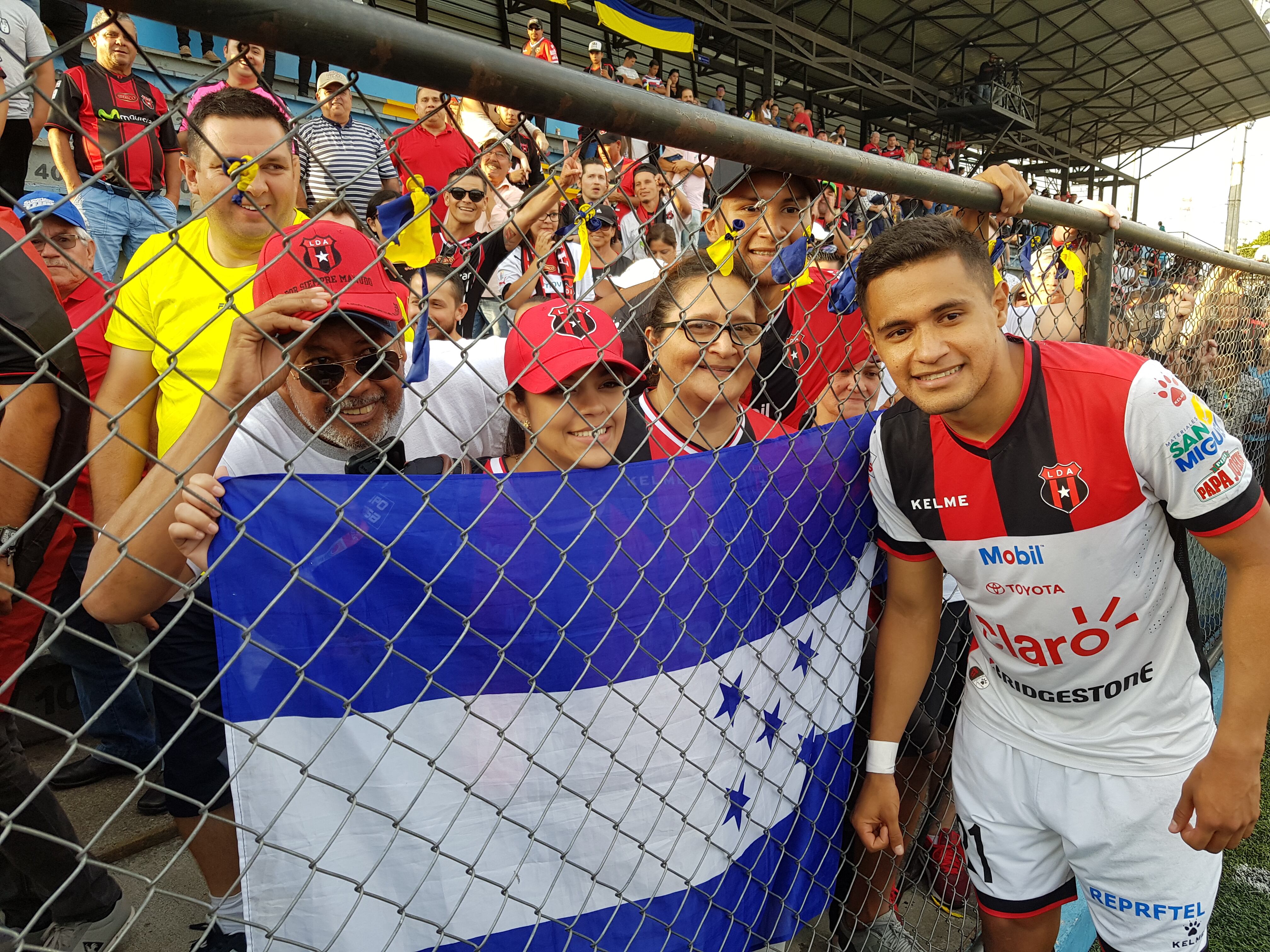 Atendía las consultas de la prensa y al terminar de responder las preguntas salió corriendo hacia la malla, donde estaban sus familiares identificados con una gran bandera de Honduras.
