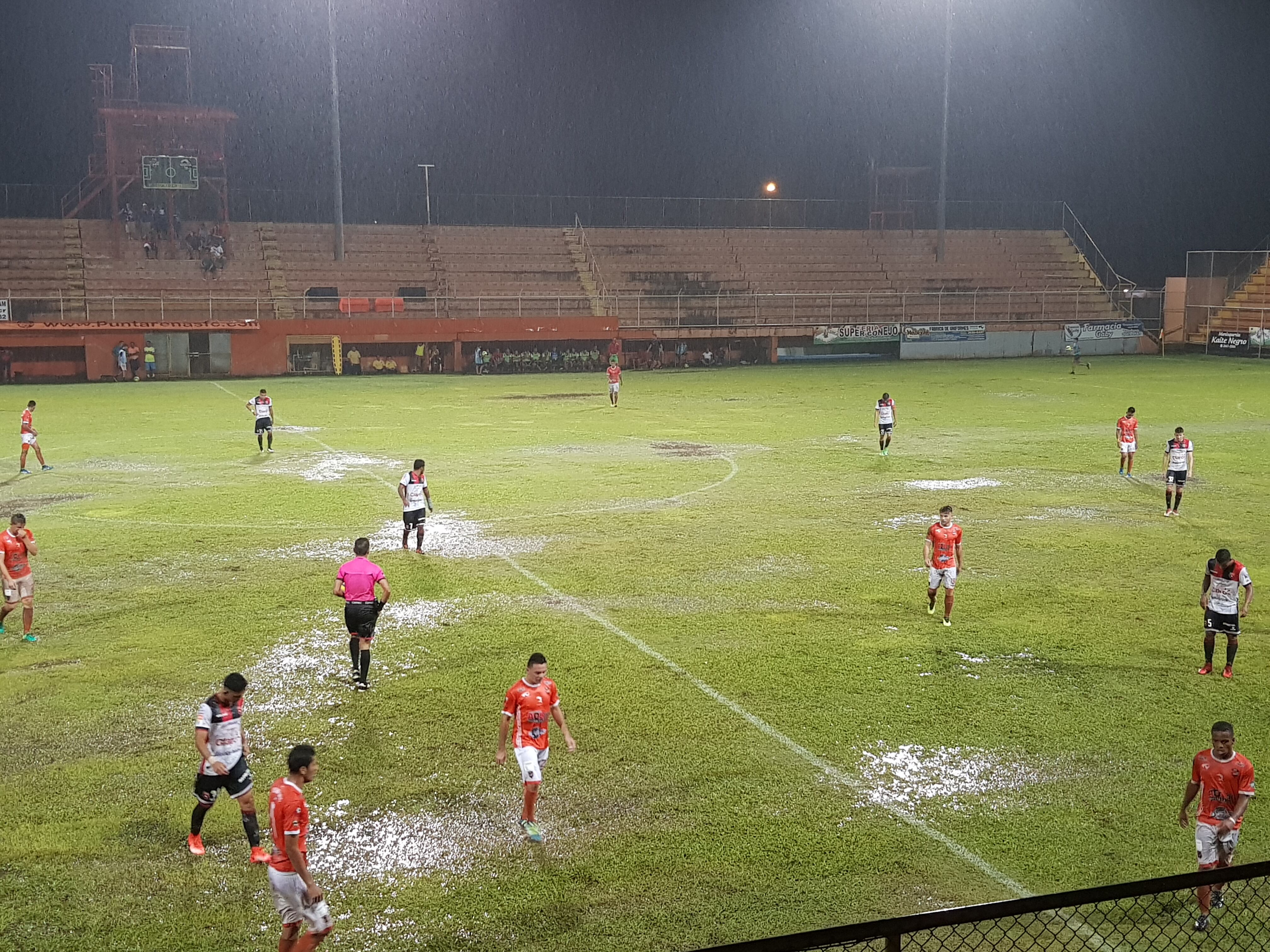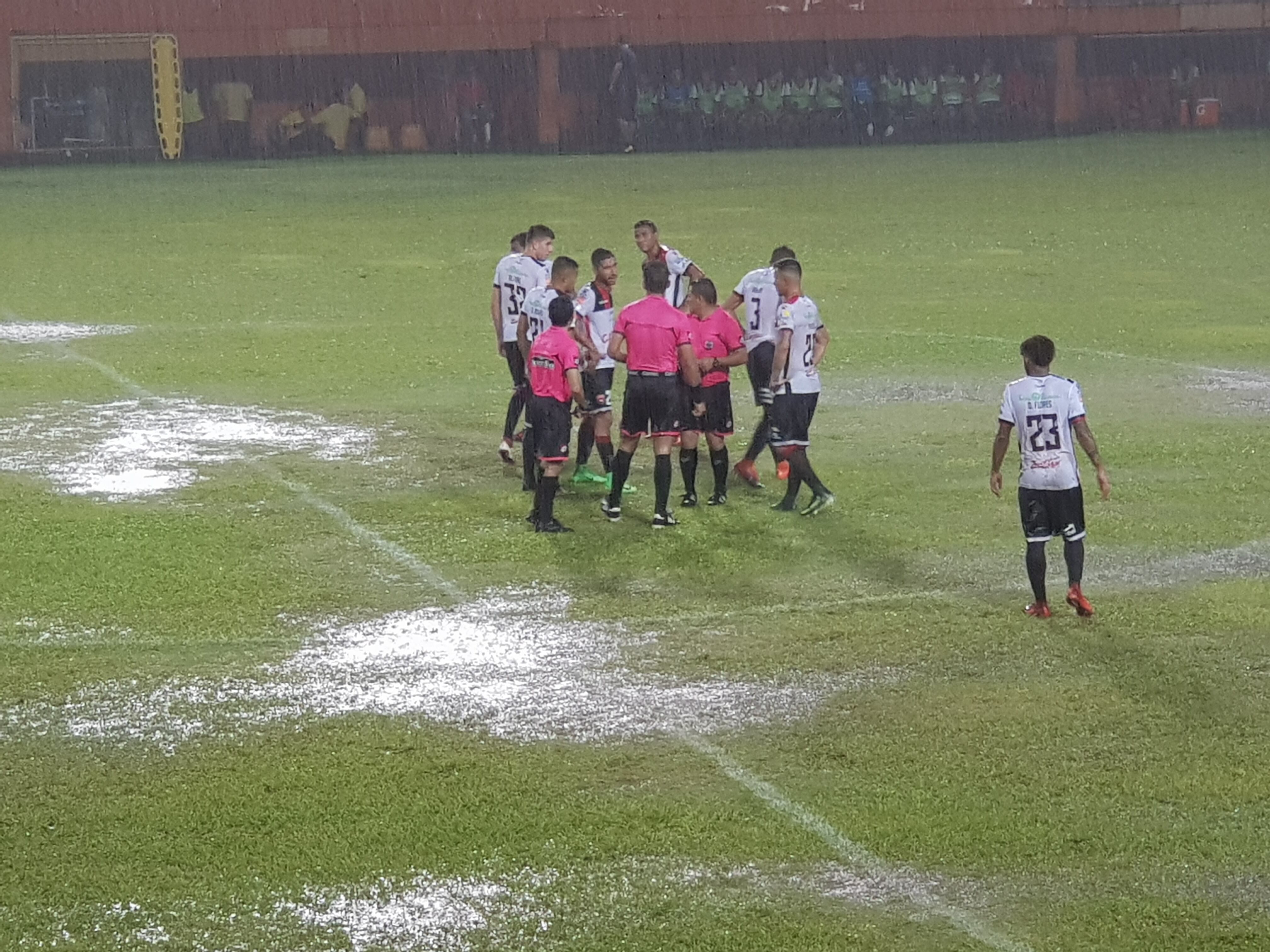 El partido estuvo suspendido varios minutos por la tempestad y porque la cancha estaba muy empozada.