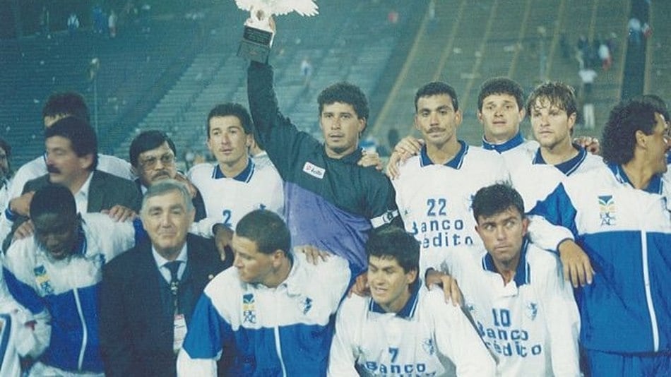 Saprissa jugó el Mundial de Clubes, al eliminar al mejor Pumas de México del 2005. El delantero japonés Kazuyoshi Miura, del club australiano Sydney FC, disputó el balón con Wálter Centeno, durante el partido de primera ronda del Mundial de Clubes del 2005. (TORU YAMANAKA/AFP)
