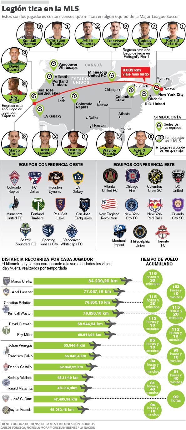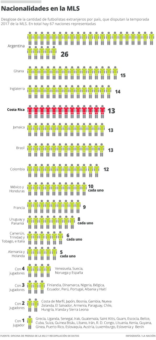 Argentina lidera la lista de extranjeros en la MLS con 26 entre los 22 equipos, seguido por Ghana con 15 e Inglaterra con 14, mientras que los ticos están representados por 13 figuras, según el análisis que realizó La Nación con los fichajes efectuados hasta el 8 de marzo y sin tomar en cuenta a estadounidenses y canadienses. VEA: Infográfico adjunto.