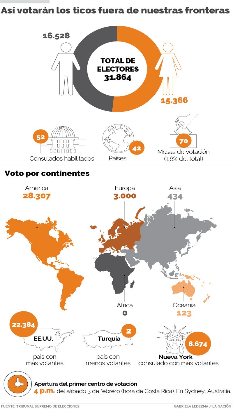 Según publicó este diario en noviembre pasado, un total de 31. 860 costarricenses tendrán la opción de ejercer su derecho en los 52 consulados que hay en 42 países. El padrón fuera de Costa Rica creció en un 152% respecto al 2014.
