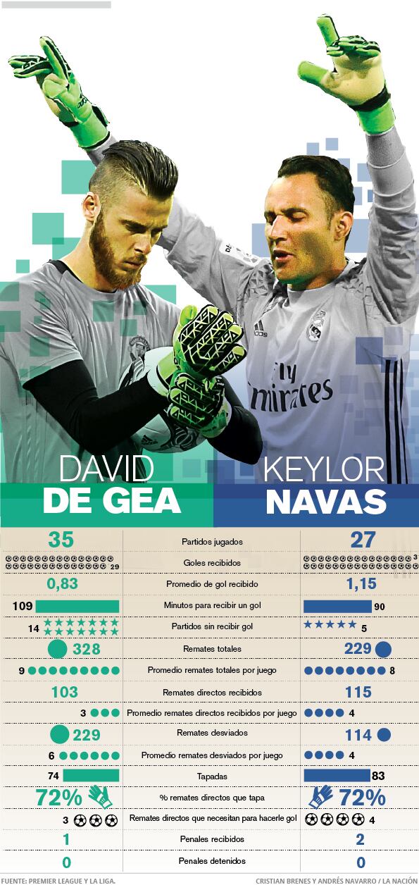 La Nación comparó el desempeño numérico del cancerbero del Manchester United y del Real Madrid juego a juego en la temporada que recién terminó y se concluyó que ambos detienen el 72% de los disparos directos que les hicieron en sus respectivas ligas.