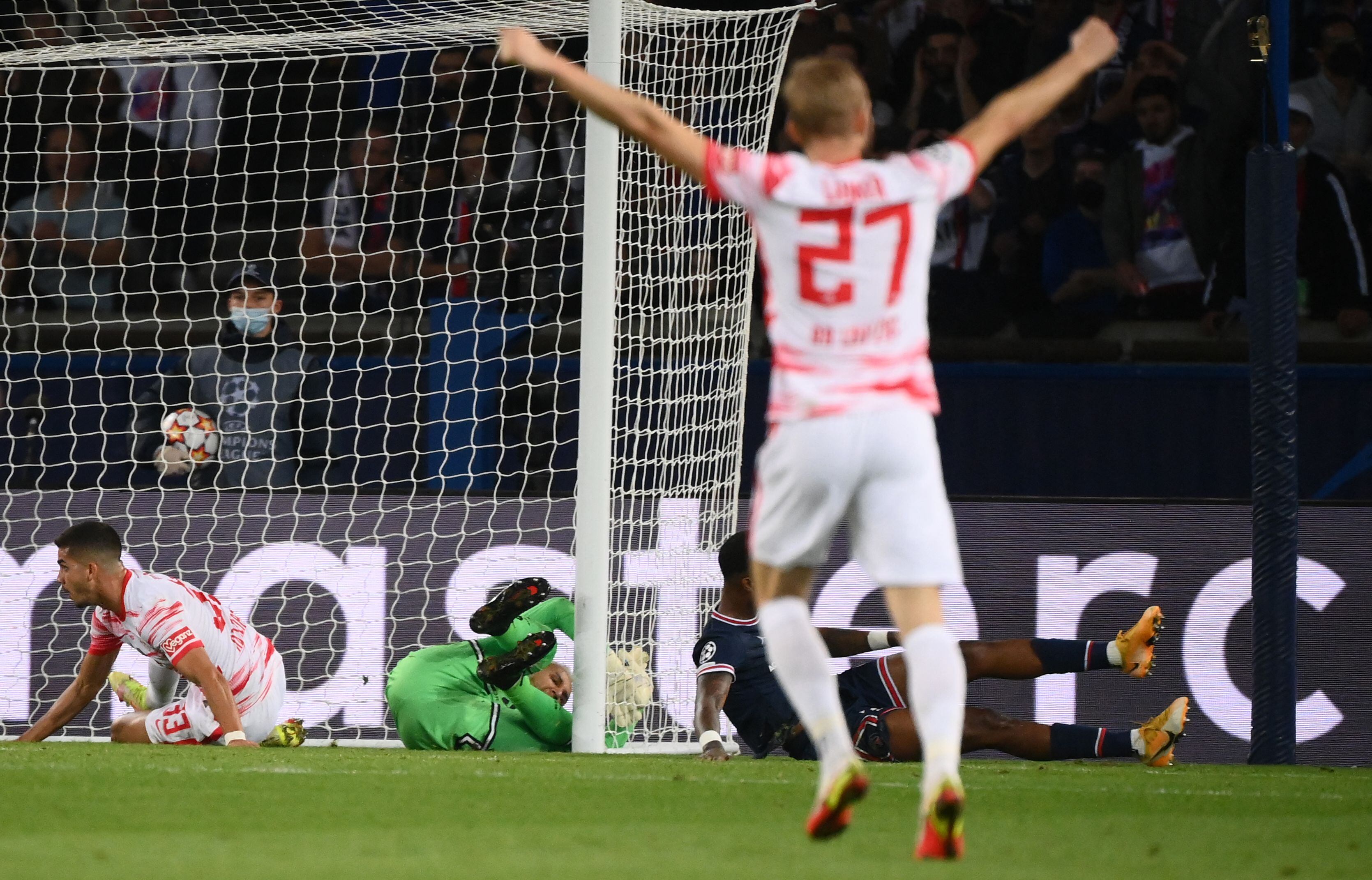 Cerca del minuto 30, el delantero del Leipzig André Silva hizo una gran jugada en el área del PSG y sacó un derechazo que reventó en el palo izquierdo de Keylor. El París se salvó.