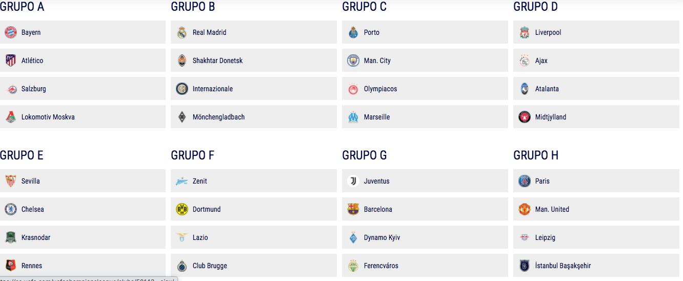Finalmente, el Manchester City de Josep Guardiola será favorito en el C, frente a Oporto, Olympiakos y Marsella, mientras que Zenit, Borussia Dortmund, Lazio y Brujas pelearán por las dos plazas en liza en el grupo F.