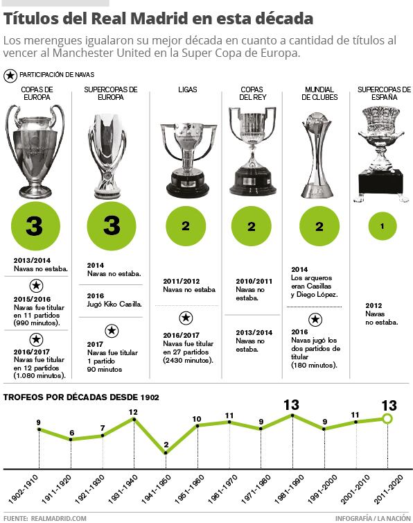 De esos 13 trofeos, el portero costarricense Keylor Navas ha sido parte de ocho: una liga de España, dos UEFA Champions League, tres Supercopas de Europa y dos Mundiales de Clubes.