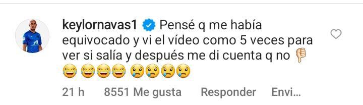 “Pensé que me había equivocado y vi el vídeo como cinco veces para ver si salía y después me di cuenta que no”, escribió en sus redes sociales el nacional junto a un emoji con el dedo abajo, cara de risas y por última una cara con una lágrima.
