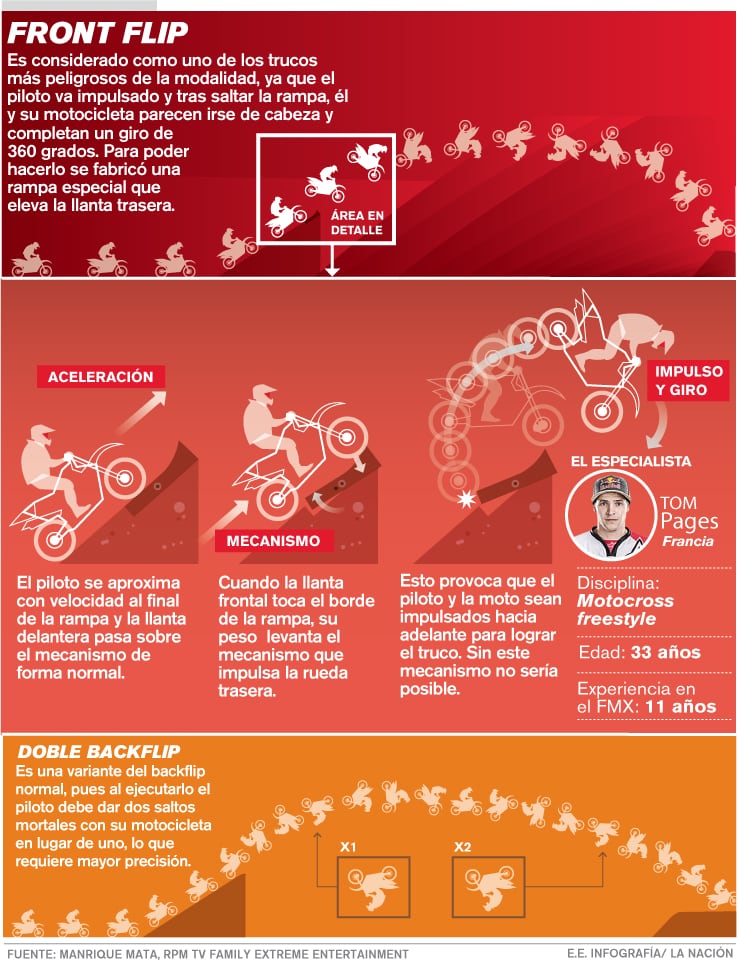 La competencia que empieza a las 7 p. m. tendrá a Pages, quien en los dos últimos años se ausentó por lesión y a Moore, actual bicampeón del evento, quienes intentarán ejecutar trucos como el front flip, que consiste en elevarse en el aire y prácticamente irse de cabeza hacia adelante y realizar un salto mortal invertido.
