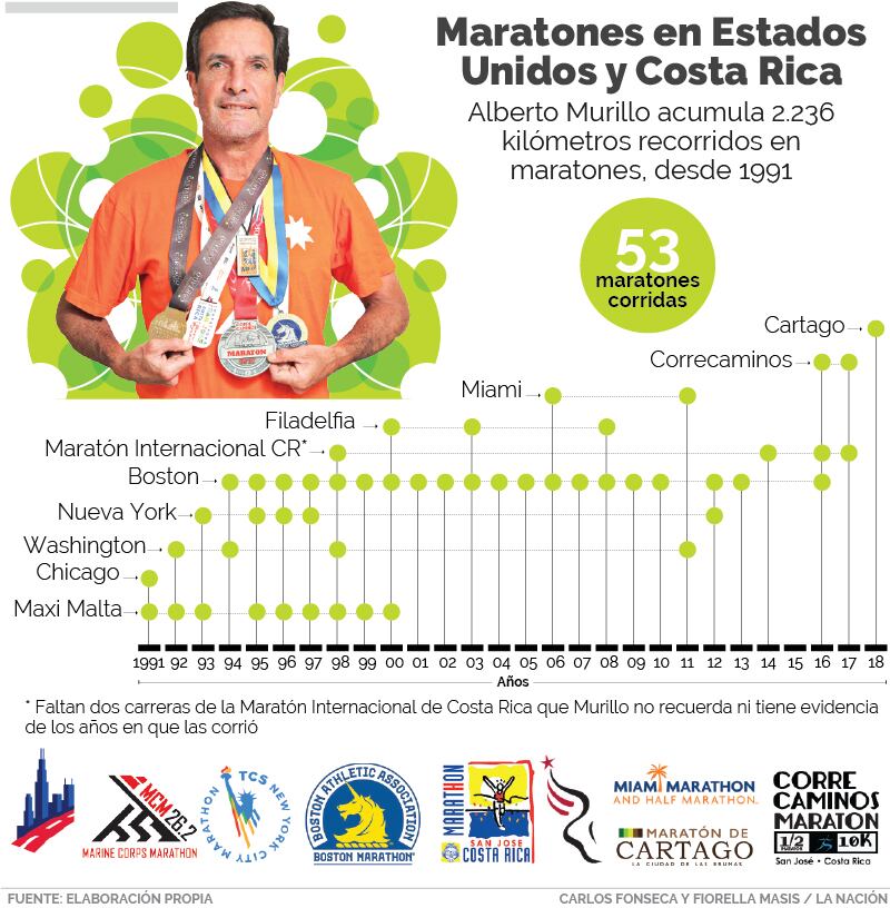 Esa es la marca que ostenta el costarricense Alberto Murillo, quien empezó a correr la distancia de 42,195 km en 1991 y desde entonces no ha parado.