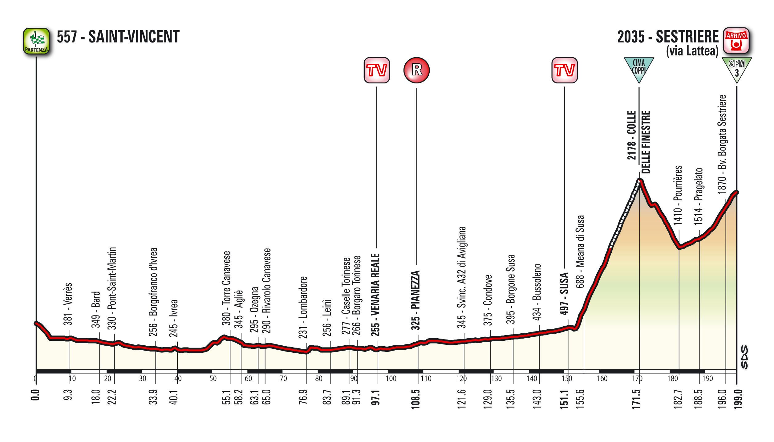 Puertos: Delle Finestre (Cima Coppi, fuera de categoría, en el kilómetro 171,5) y Sestriere (3° categoría, en el kilómetro 199).