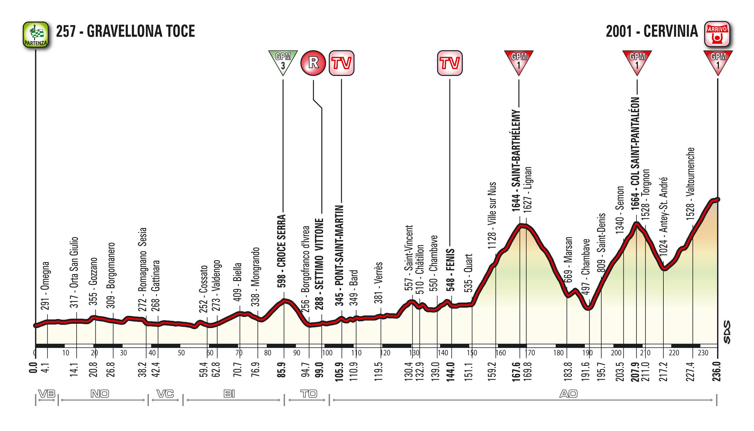 Puertos: Croce Serra (3° categoría, en el kilómetro 85,9), Saint_Barthélemy (1° categoría, en el kilómetro 167,6), Col Saint-Pantaleón (1° categoría, en el kilómetro 207,9) y Cervinia (1° categoría, en el kilómetro 236).