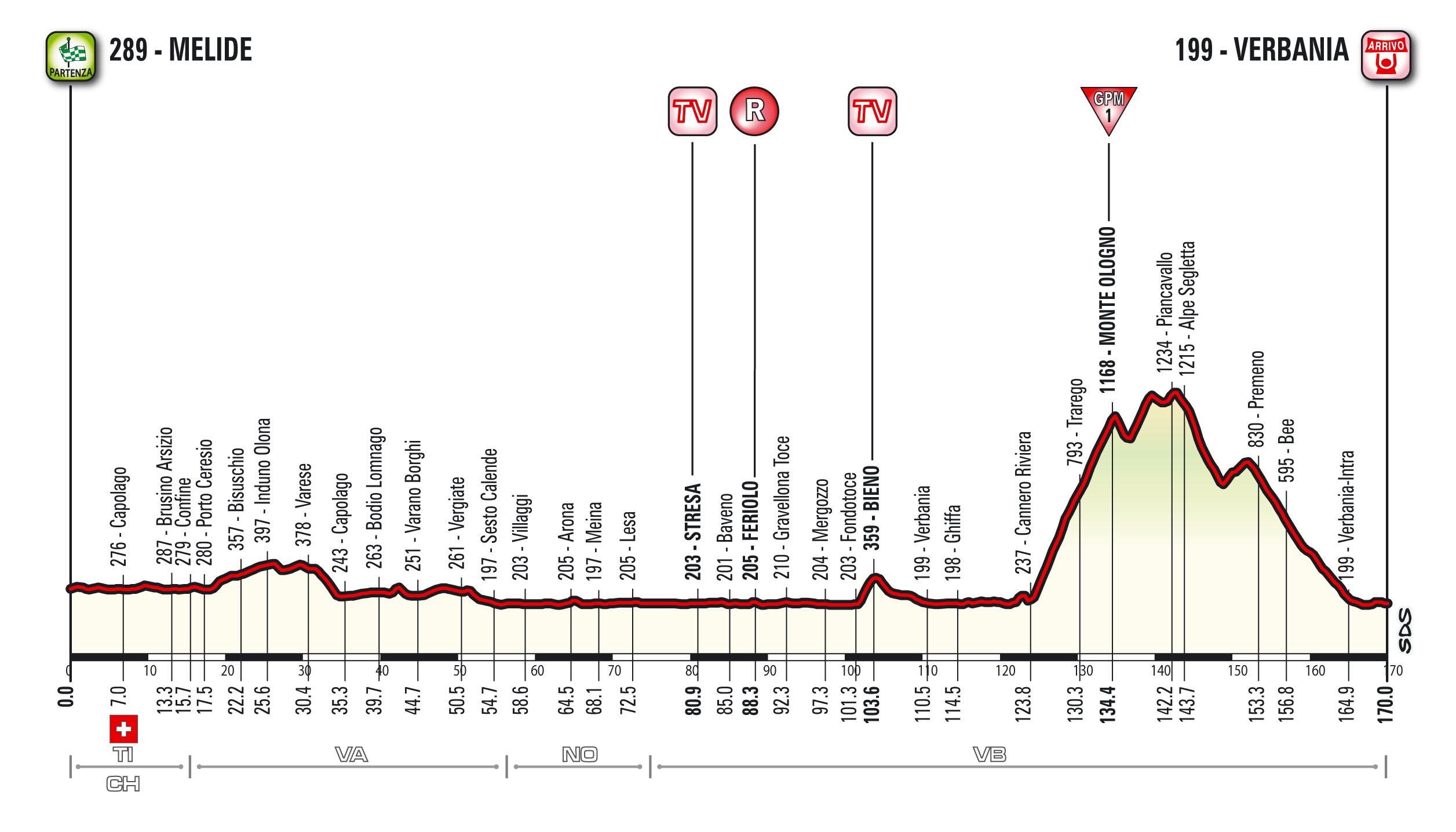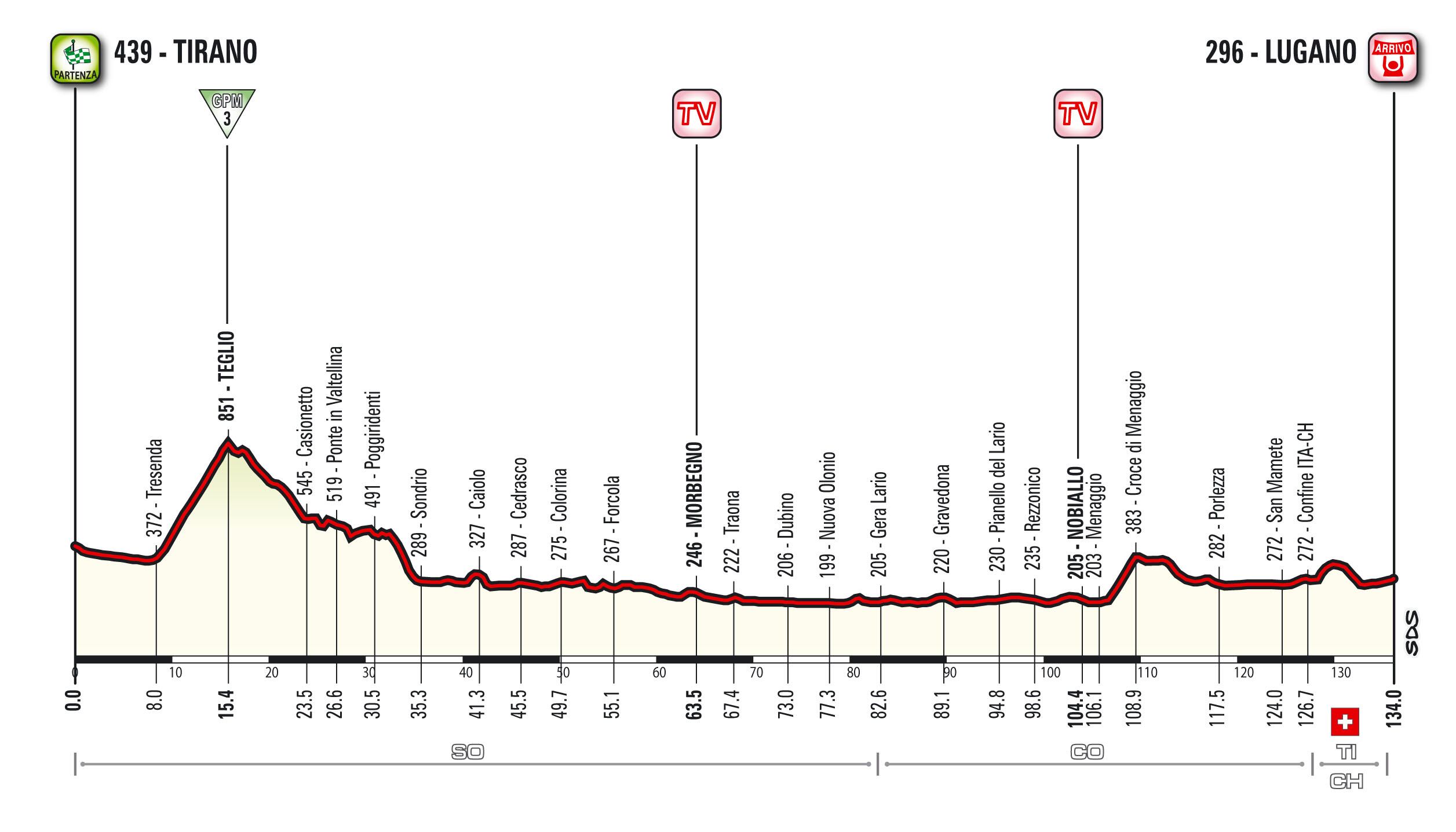 Puertos: Campo Carlo Magno (2° categoría, en el kilómetro 13), Passo del Tonale (2° categoría, en el kilómetro 55,2), Aprica (3° categoría, en el kilómetro 102), Passo del Mortirolo (1° categoría, en el kilómetro 142,1) y Aprica (3° categoría, en el kilómetro 177).