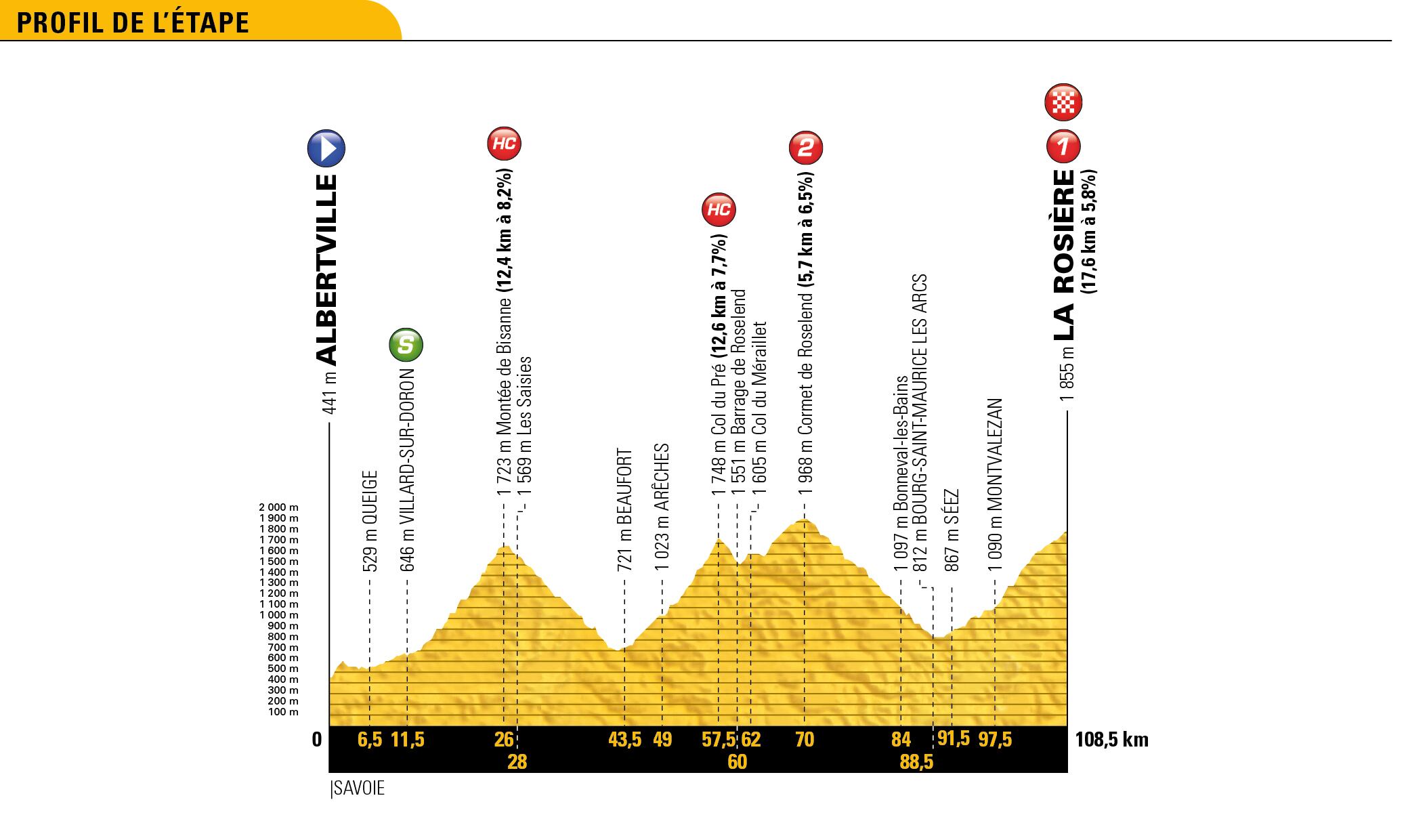 El Tour, imitando el modelo de éxito de la Vuelta, probará el miércoles 18 con una etapa breve (108 kilómetros) y muy dura, con Bisanne (fuera de categoría), Pré (fuera de categoría), Cormet de Roselend (segunda categoría) y La Rosière (primera categoría), ya cubierta un mes y medio antes en el penúltimo día del Dauphiné.