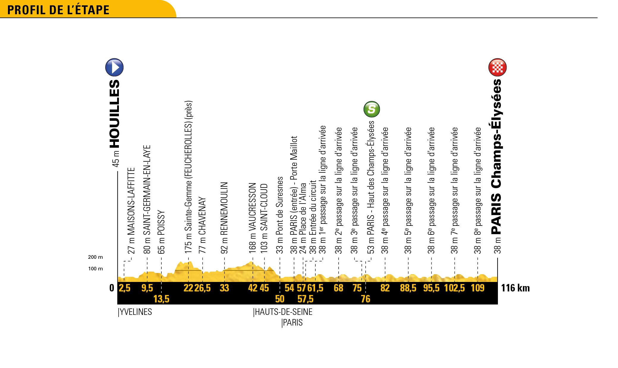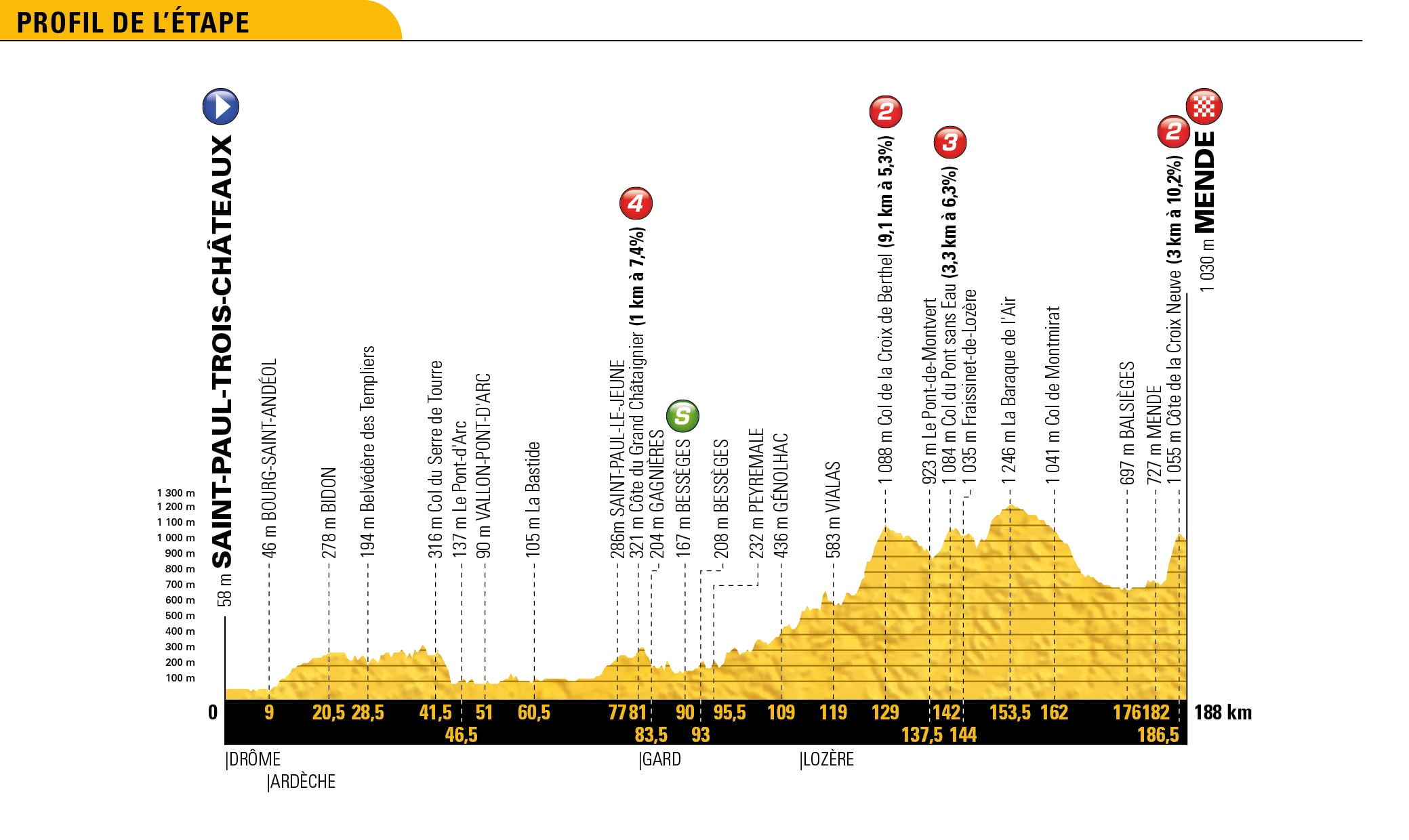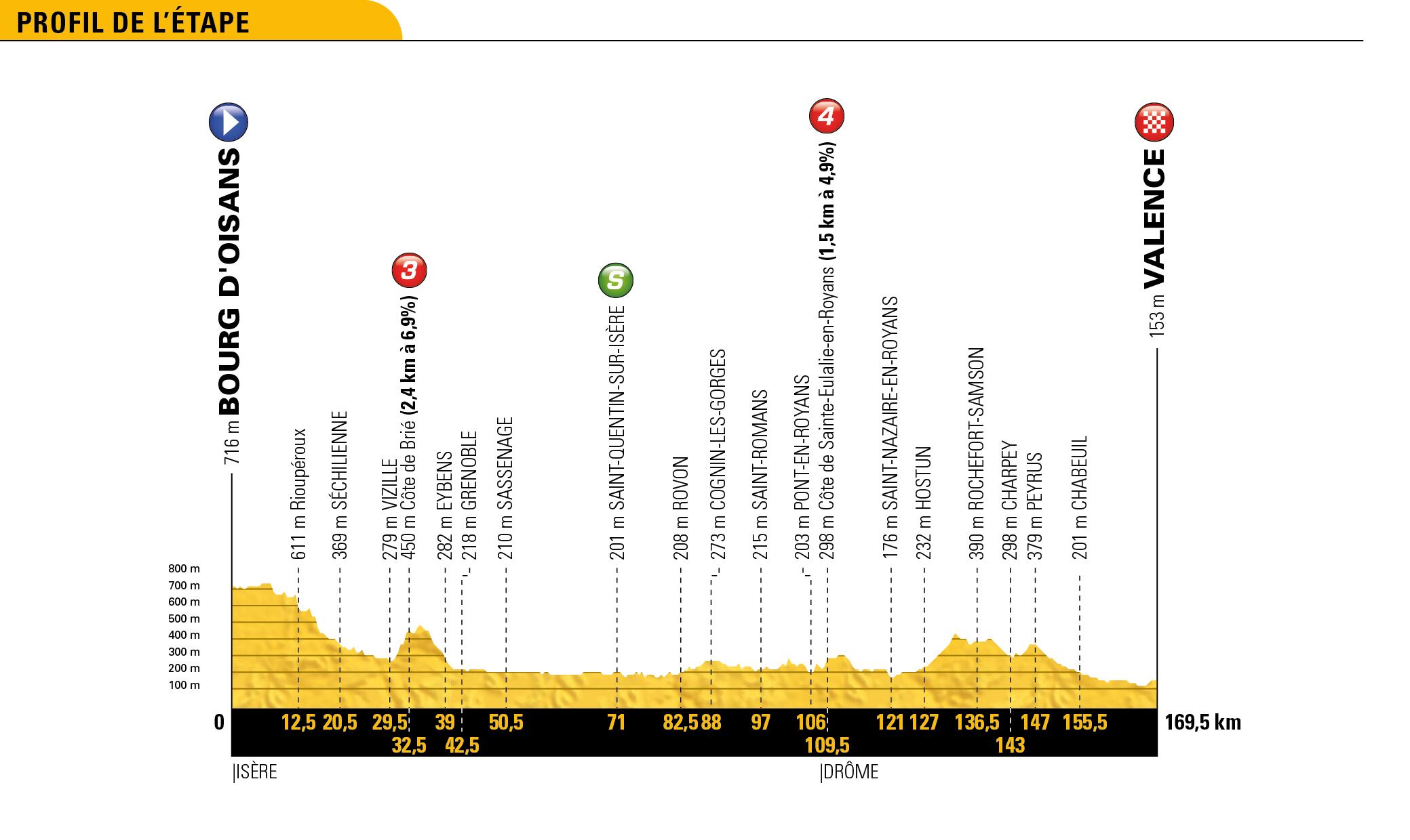 Para cerrar los Alpes, un kilometraje más clásico (175 kilómetros) y de puertos míticos: Madeleine (fuera de categoría), los Lacets de Montvernier (segunda categoría), Croix-de-Fer (fuera de categoría) desde Saint-Jean-de-Maurienne y final en el puerto más mediático, Alpe d’Huez (fuera de categoría).