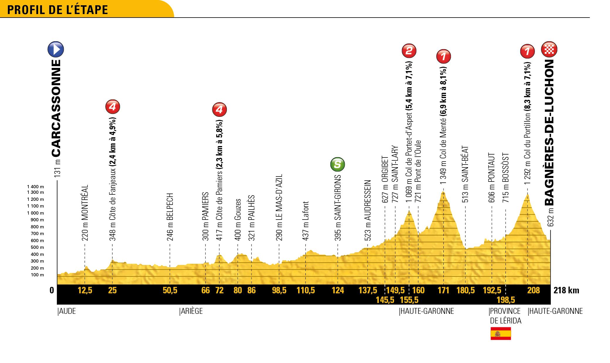 La etapa 16 (martes 24) visitará brevemente España, con Portet d’Aspet (segunda categoría), Menté (primera categoría) y rápida bajada desde el Portillón (primera categoría) hasta Bagnères-de-Luchon… en un día de 218 kilómetros.