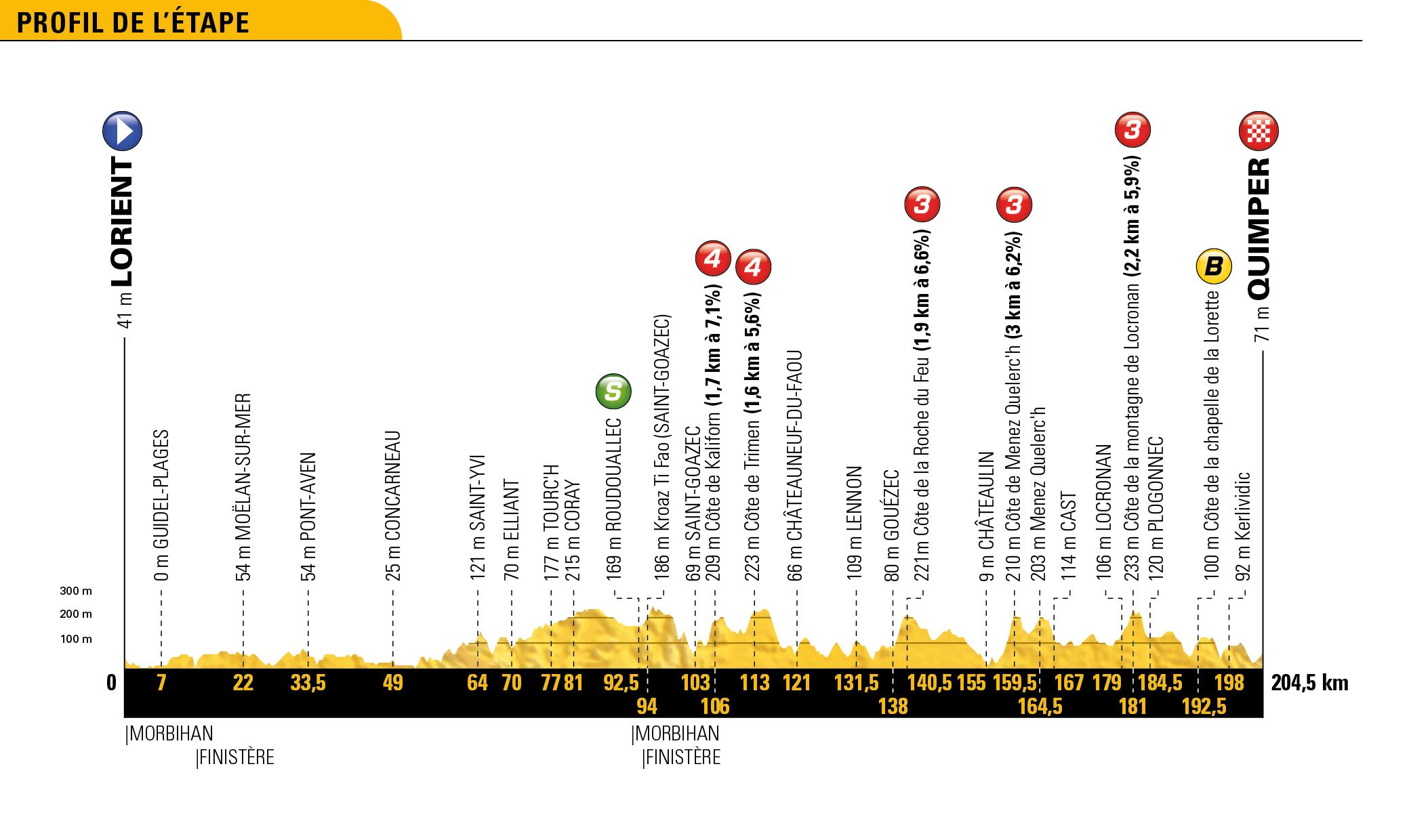 Dos, de hecho, acabarán en alto: la de Quimper (miércoles 11), toda una clásica con cinco altos puntuables y decenas de ascensos en su segunda mitad, y la del Mûr-de-Bretagne (jueves 12), subida final ya utilizada en 2011 y 2015.