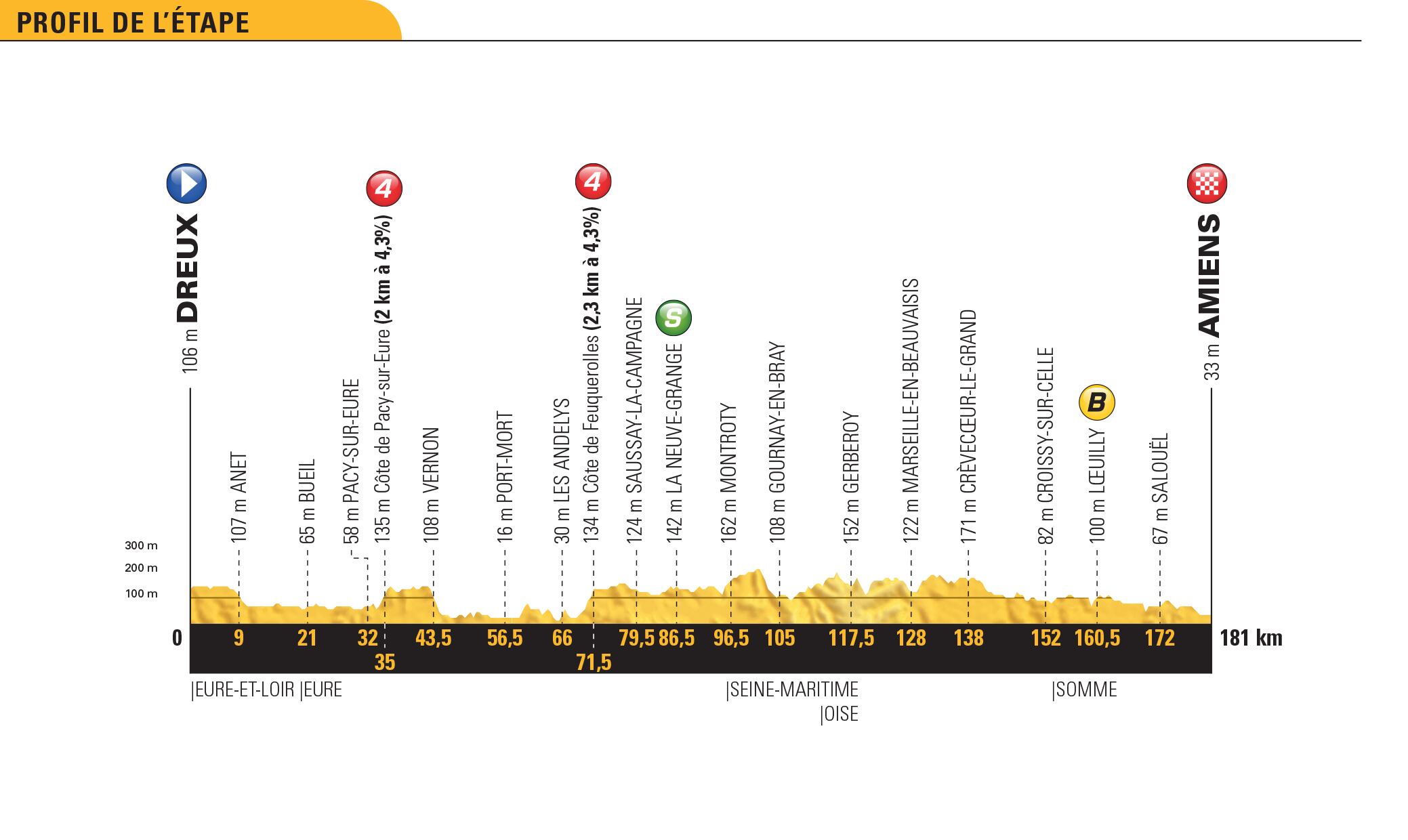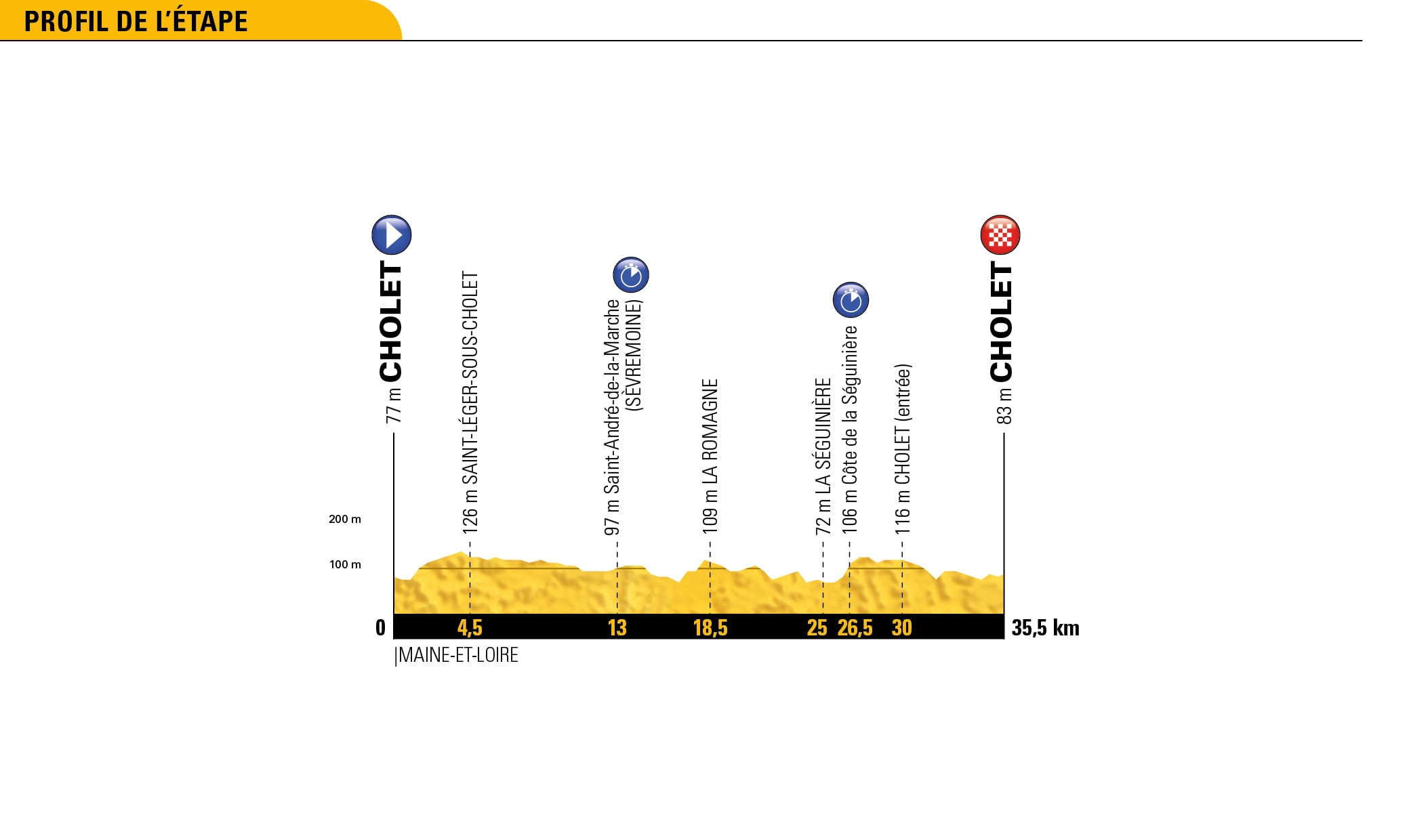 Dos etapas a buen seguro muy nerviosas, con finales en Fontenay-le-Comte (201 kilómetros, sábado 7; mucho recorrido costero) y La Roche-sur-Yon (182,5 kilómetros, domingo 8), abrirán la acción en una carrera cuyas primeras diferencias llegarán muy pronto, en una crono por equipos de 35,5 kilómetros (lunes 9) en Cholet, con algunos repechos entre los que se encontrará la Côte de la Seguinière, a nueve del final.