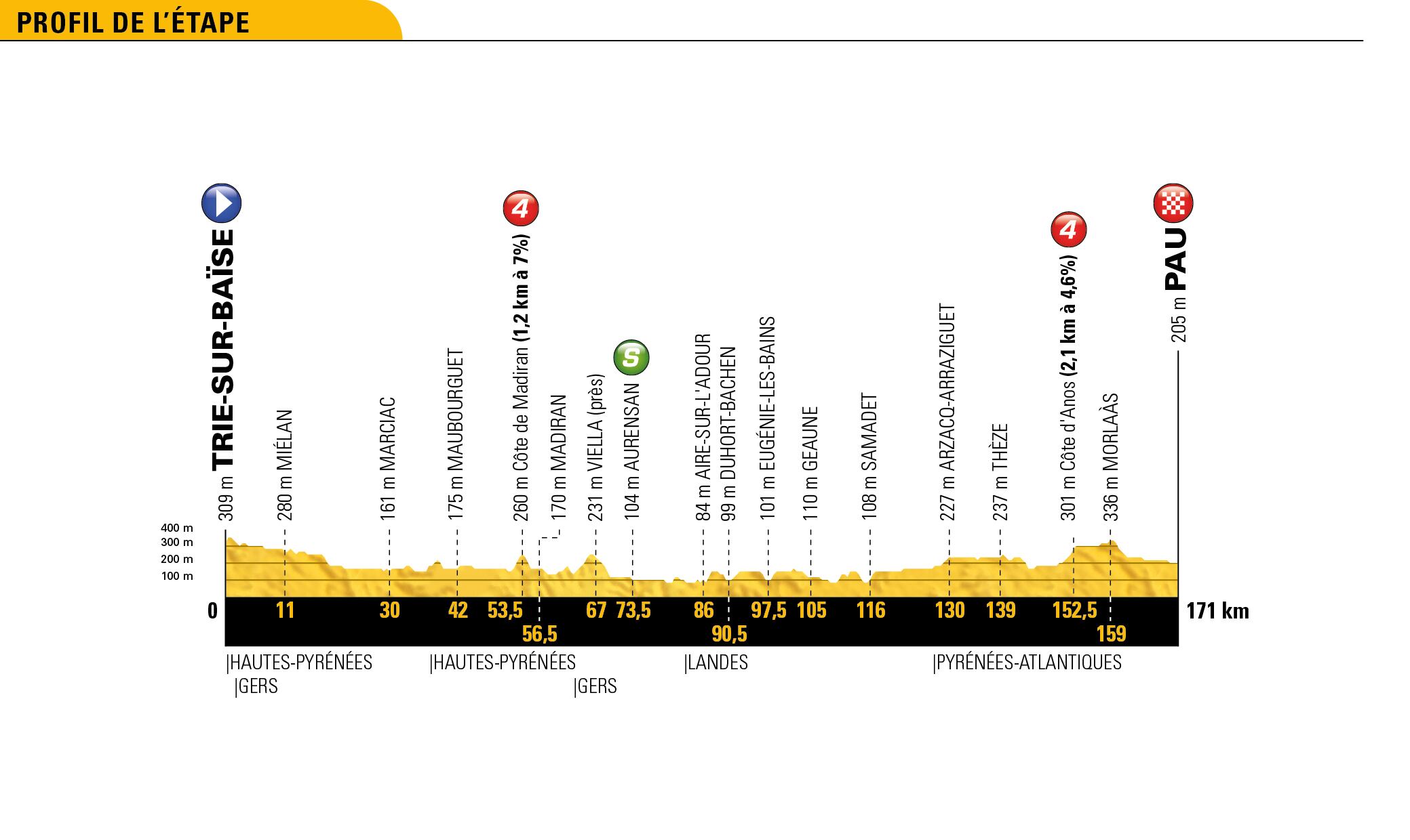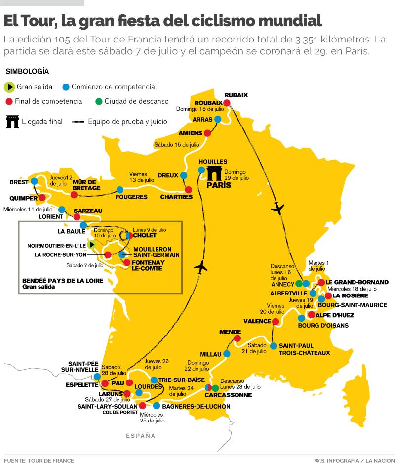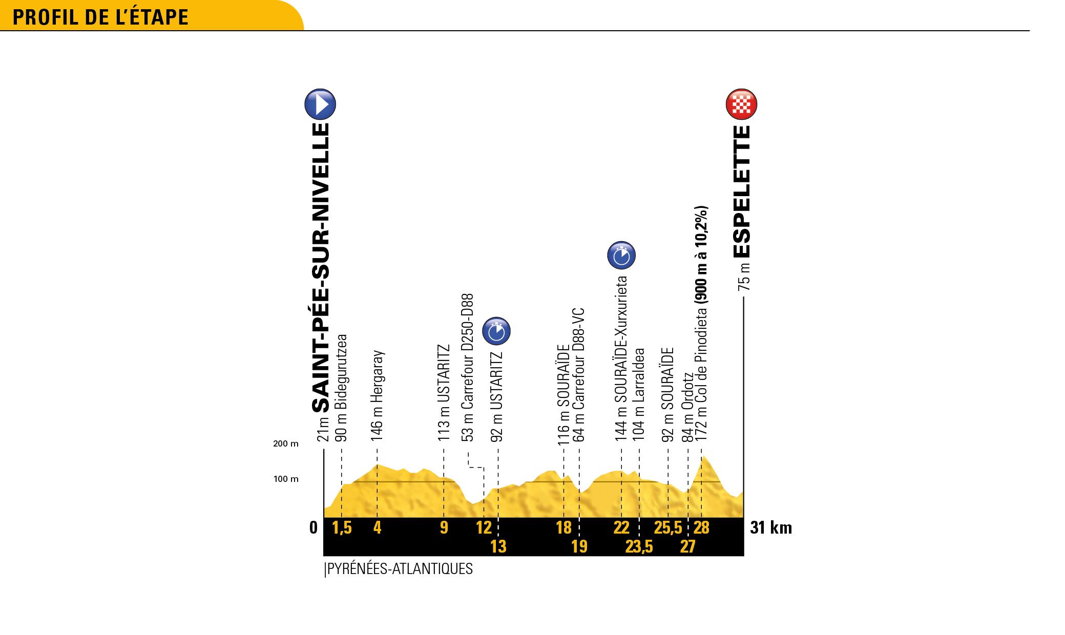 Y el sábado 28, la única contrarreloj individual: un recorrido nada llano, incluso con un ascenso de 900 metros al 10% antes de meta, por el País Vasco francés, entre Senpere (Saint-Pée-sur-Nivelle) y Ezpeleta (Espelette), 31 kilómetros en total.