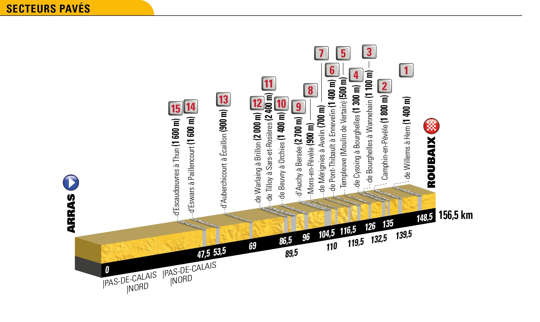 Dos jornadas llanas hacia el interior -Chartres y Amiens; viernes 13 y sábado 14- conducirán la carrera hacia el día que muchos corredores más temen: el del pavé en Roubaix (domingo 15), con quince tramos y 21 kilómetros que imitan de un modo casi totalmente fiel el recorrido final de la ‘Clásica de las Clásicas’.