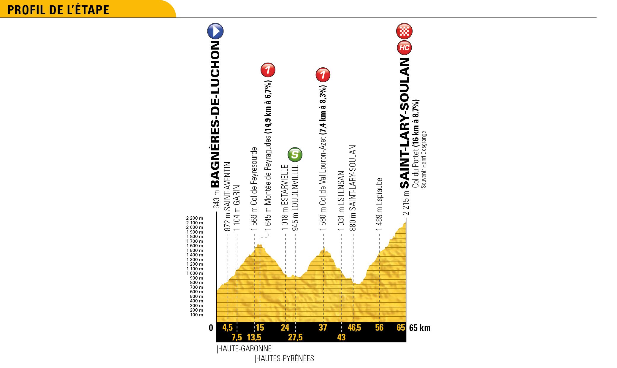 El extremo opuesto a esta dura exigencia lo constituirá la innovadora y chocante etapa 17 (miércoles 25): ¡65 kilómetros! -en línea, no es crono-, con parrilla de salida incluida -al estilo del mountain bike o el ciclocross-, sin un solo metro llano, superando Peyragudes (primera categoría), Val Louron (primera categoría) y final en Portet (categoría especial).