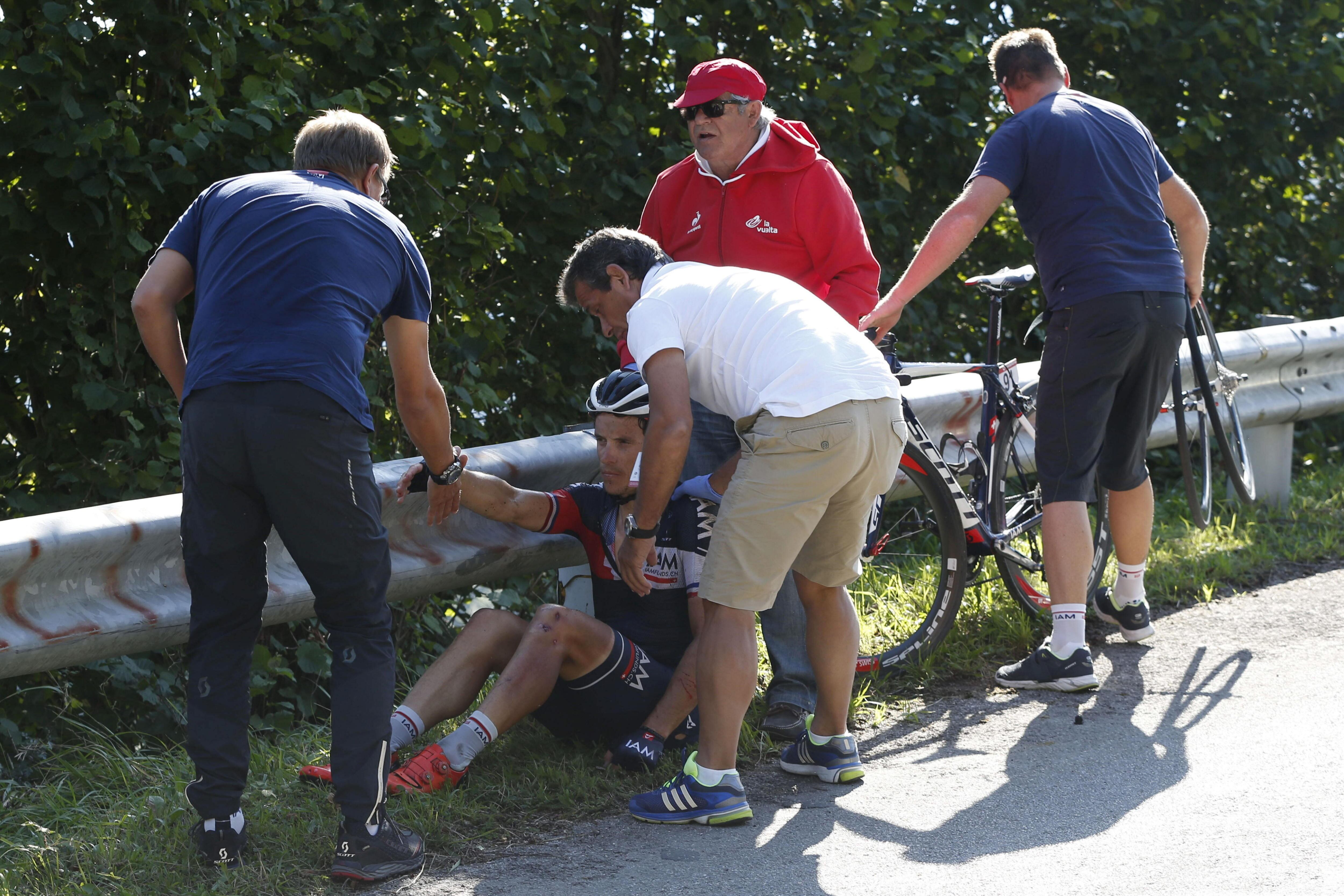 Caída de Sylvain Chavanel (IAM Cycling) y de Leonardo Duque (Team Colombia) en la bajada de Cordal.