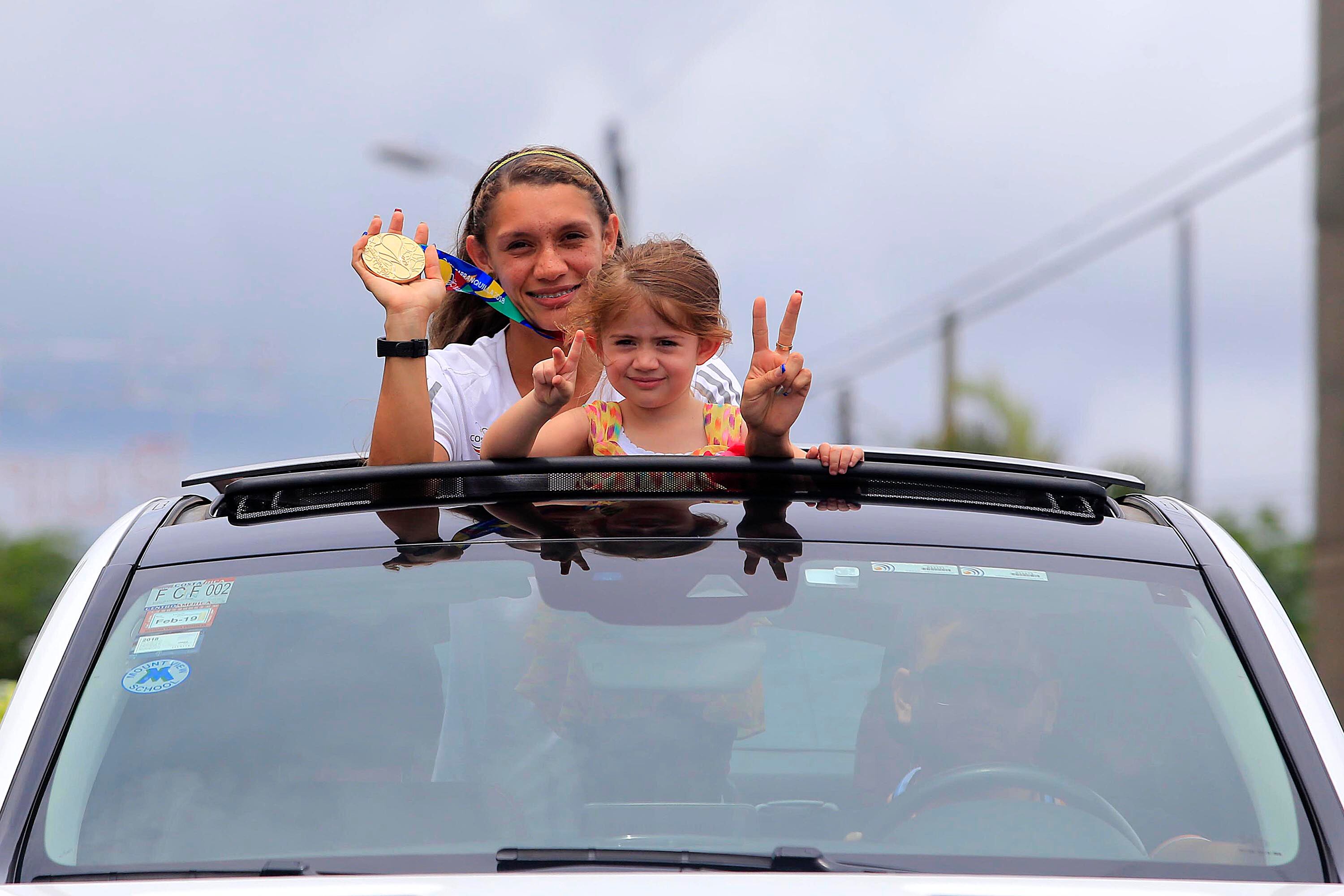Con su hija en brazos también mostró la medalla de oro. Al costado de la carretera habían niños, niñas, mujeres y hombres. Muchas personas también sacaron la bandera de Costa Rica en señal de agradecimiento. La sonrisa en su rostro lo decía todo. “Gracias, gracias... de verdad muchas gracias”, fue su frase favorita mientras duró el recorrido. Uno de los momentos cumbre fue cuando pasó por la Cruz Roja, en un angosto espacio abarrotado por la gente.