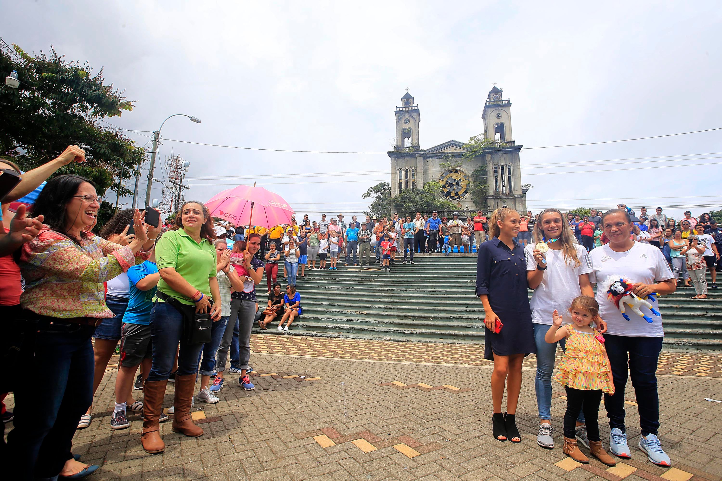 Andrea llegó a Puriscal a las 12:13 p. m. Sacó su medalla por el quema cocos de un vehículo blanco en el que venía del aeropuerto. La gente salió de sus casas y le aplaudió. Le aplaudió mucho. Los carros le pitaron.