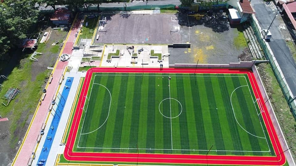 Incluso tampoco fue hecha de asfalto o algún otro material común en las estructuras de este tipo en el país, sino más se utilizó el mismo zacate sintético y caucho que tiene la cancha de fútbol siete. La única diferencia entre ambas es el color, precisamente para diferenciarlas.