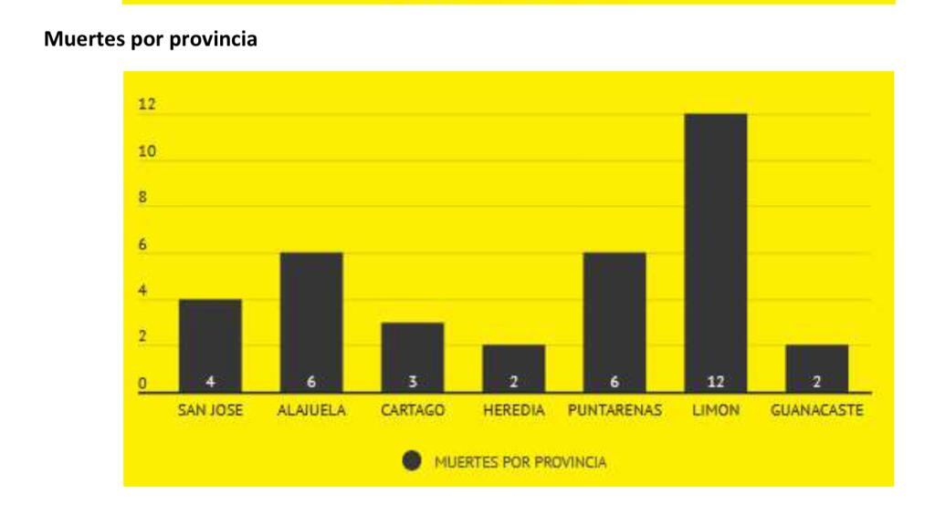 Después de la provincia caribeña, le siguen en cantidad de decesos Puntarenas y Alajuela con 6, San José con 4, Cartago con 3 y Heredia y Guanacaste con 2.