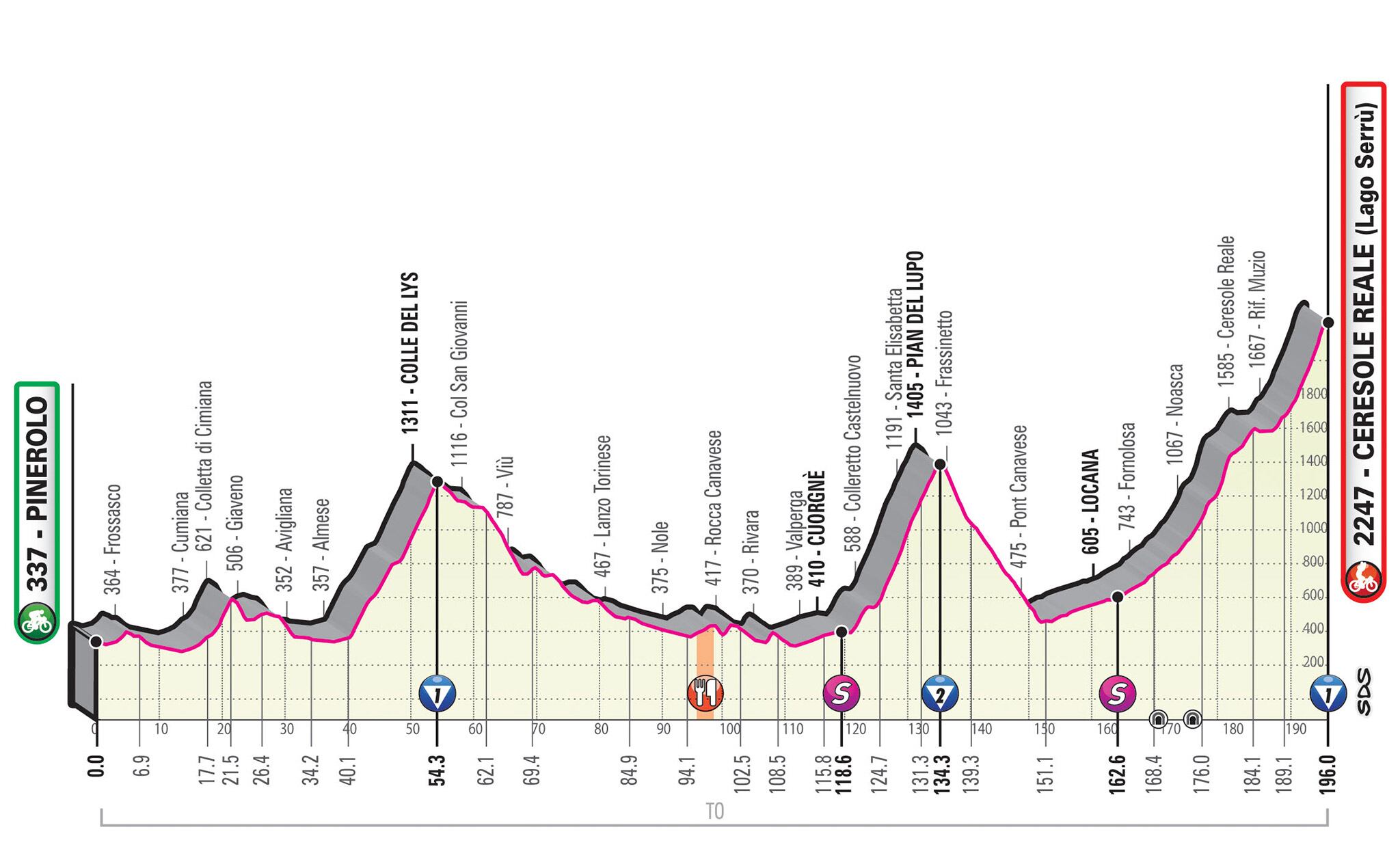 Fueron 196 kilómetros duros entre Pinerolo y Ceresole Reale, con un trayecto muy complejo que la altimetría lo presentaba como un serrucho rompepiernas.