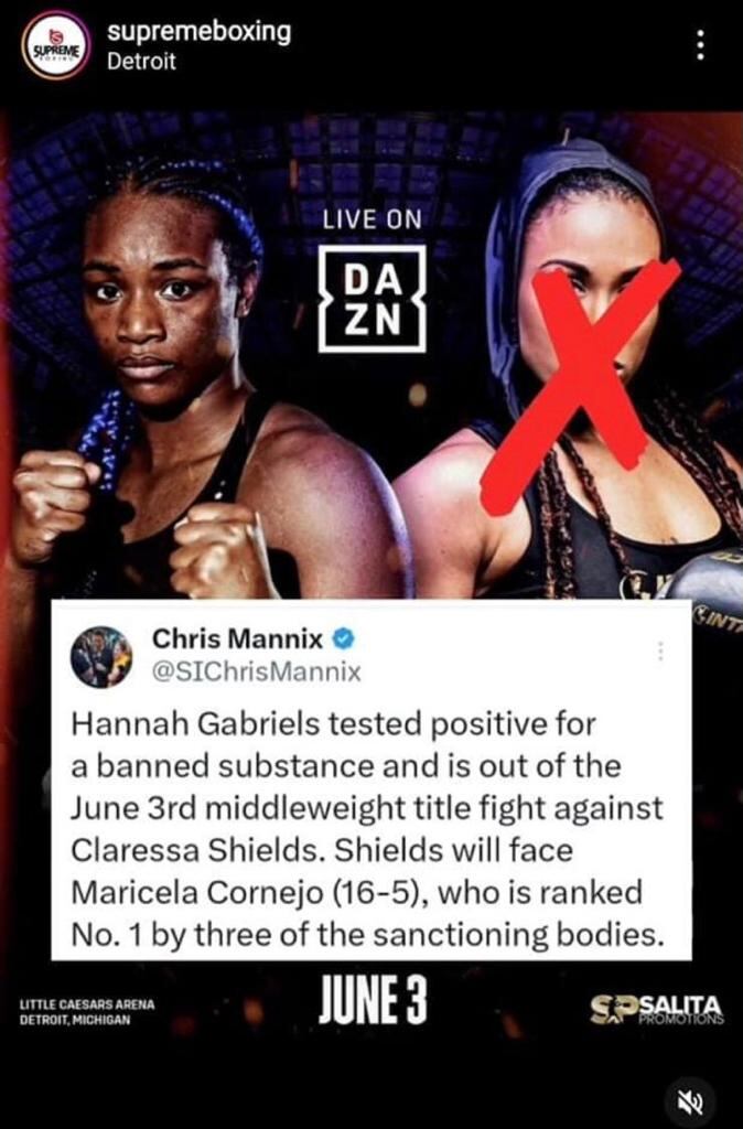 “Hanna Gabriel dio positiva de una sustancia prohibida y está fuera de la pelea por el título de peso medio que se iba a realizar el próximo 3 de junio ante la estadounidense Claressa Shields, en Detroit, Estados Unidos. La costarricense será sustituida por Maricela Cornejo, quien está clasificada en el puesto número uno en el ranquin”, se indicó en la cuenta de Facebook del sitio especializado.