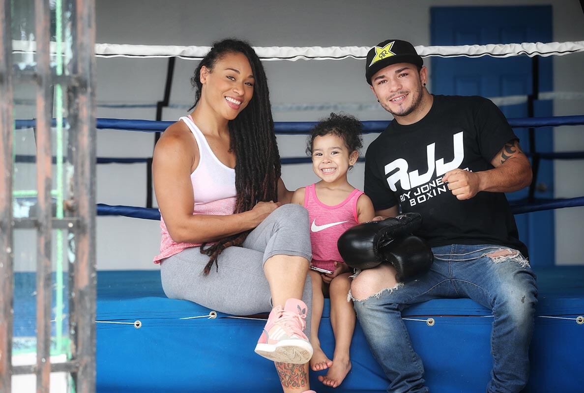 Como única testigo de sus ejercicios y movimientos en el cuadrilátero, la pequeña Mía, hija del matrimonio, juega con un teléfono celular, mientras su mamá se faja en cada golpe, guiada por Vásquez y el entrenador Pedro González.
