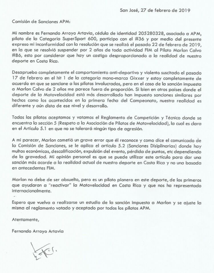 Martínez dijo que intentará hablar directamente con la Federación Internacional de Motociclismo (FIM), mientras Calvo dijo que hace lo “humanamente” posible para que revalúen la sanción, por ejemplo, recolectar cartas de apoyo de otros pilotos y empezar un método de apoyo mediante su blog elpilotocr.com.