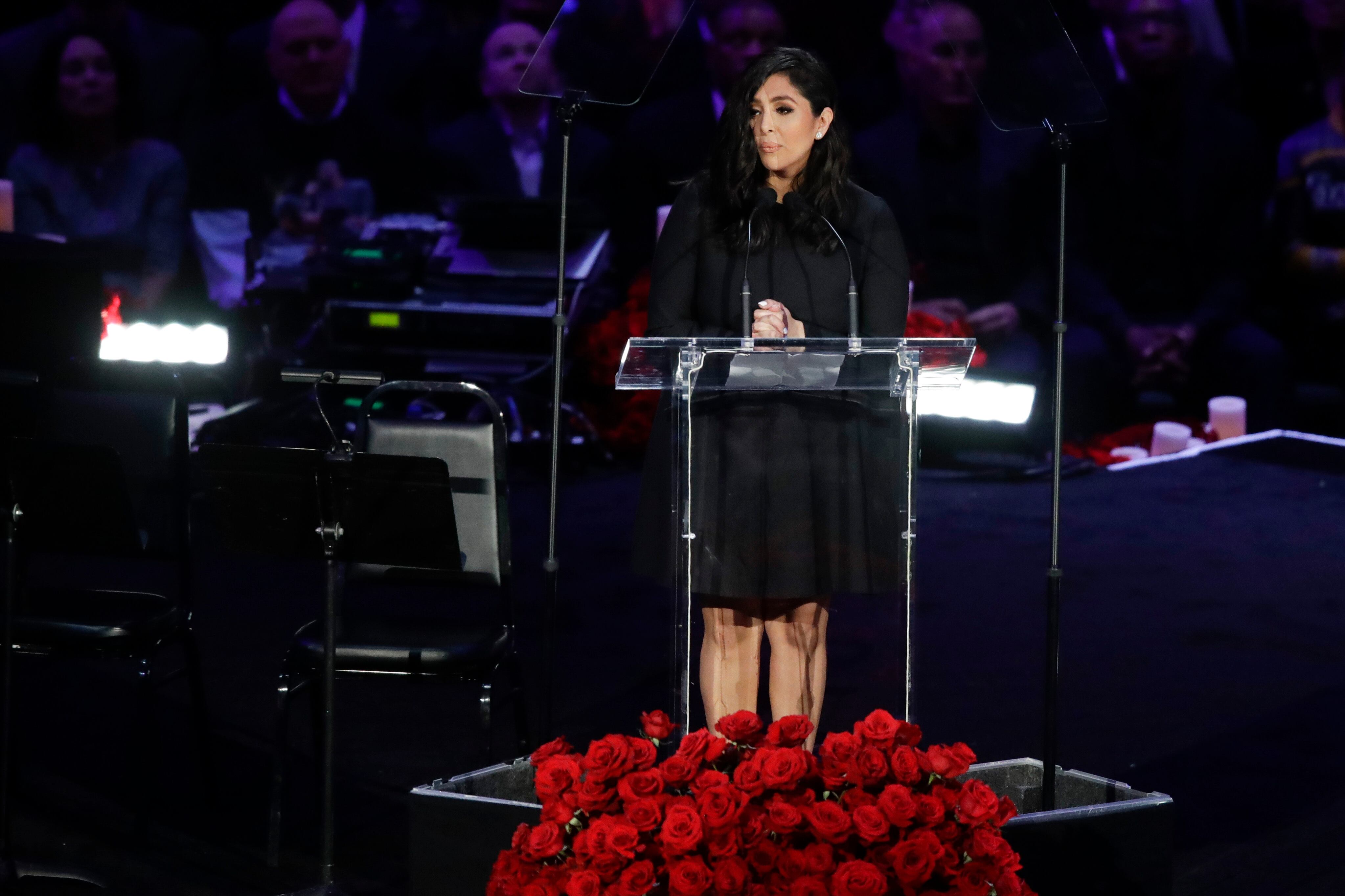 En un discurso en ocasiones interrumpido por las lágrimas, Vanessa Bryant elogió la devoción de su esposo al dirigirse a miles de aficionados que acudieron a la arena para dar el último adiós a Bryant y su hija Gianna, de 13 años.