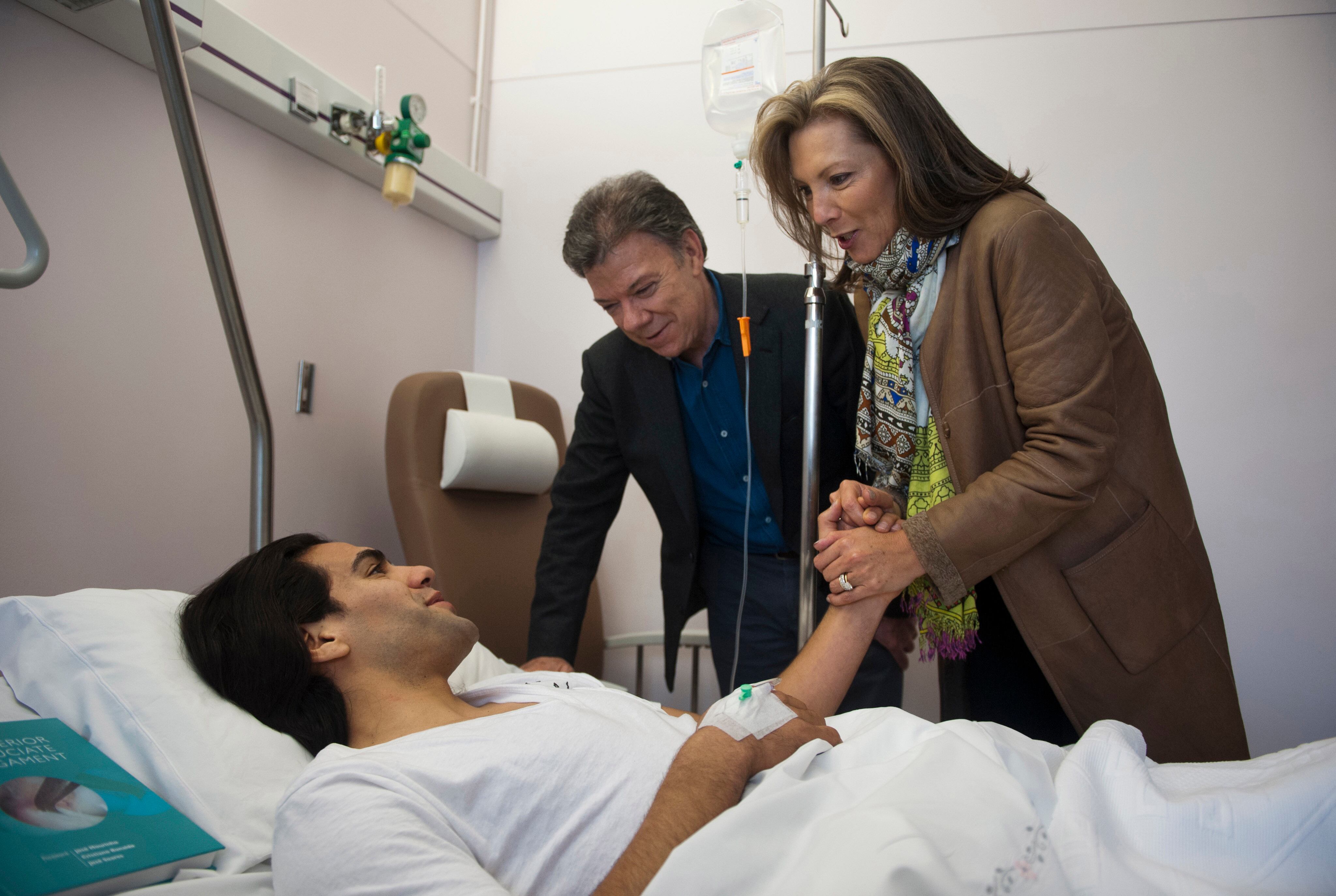 El presidente de Colombia, Juan Manuel Santos, visitó hoy al delantero quien se recupera de una cirugía y envió “una señal de tranquilidad y optimismo” al país.